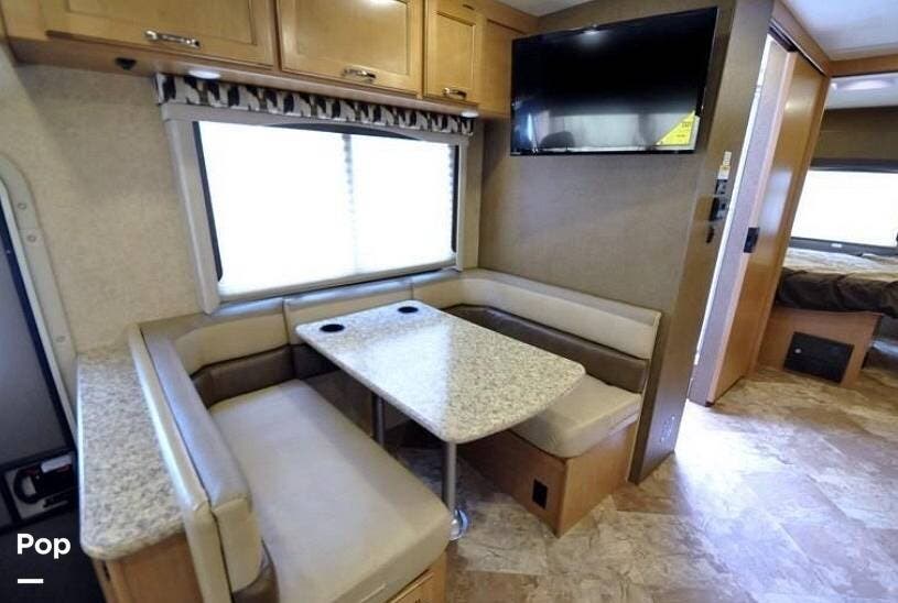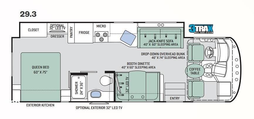 You can relax on the 60" x 40" jackknife sofa, or the 60" x 40" booth-style dinette, and enjoy the flat screen TV.