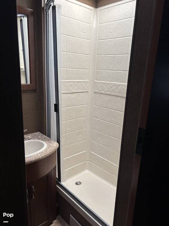 The bathroom provides a sink with a large vanity, toilet, and 36" x 24" shower.