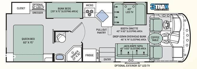 Stepping into the living area, the sofa and dinette sit directly across from each other, creating a natural gathering space. The main TV is mounted above the dinette, making it easy to view from both seating areas. This layout keeps the living area open and functional without clutter, and the dropdown bunk above the cab lowers when needed to add even more sleeping space.