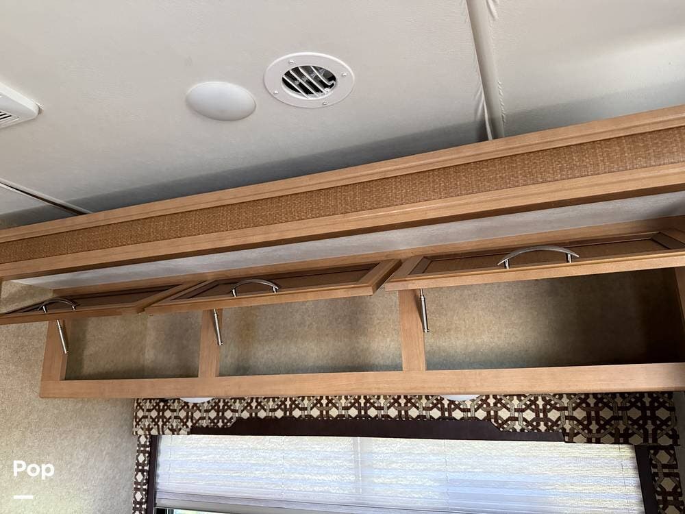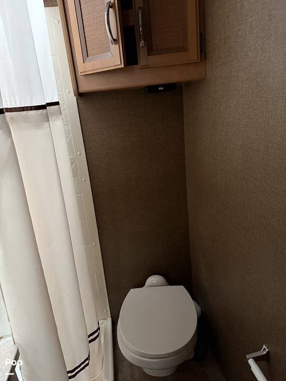 Toward the rear, the twin-bed configuration in the bedroom provides sleeping flexibility, as the beds can remain separate or be converted into a single king-size bed with the included insert. Overhead cabinets and bedside storage provide ample space for clothing and personal items, while a privacy curtain lets you separate the sleeping area from the rest of the coach. Built-in reading lights and nearby outlets add convenience for nighttime use.