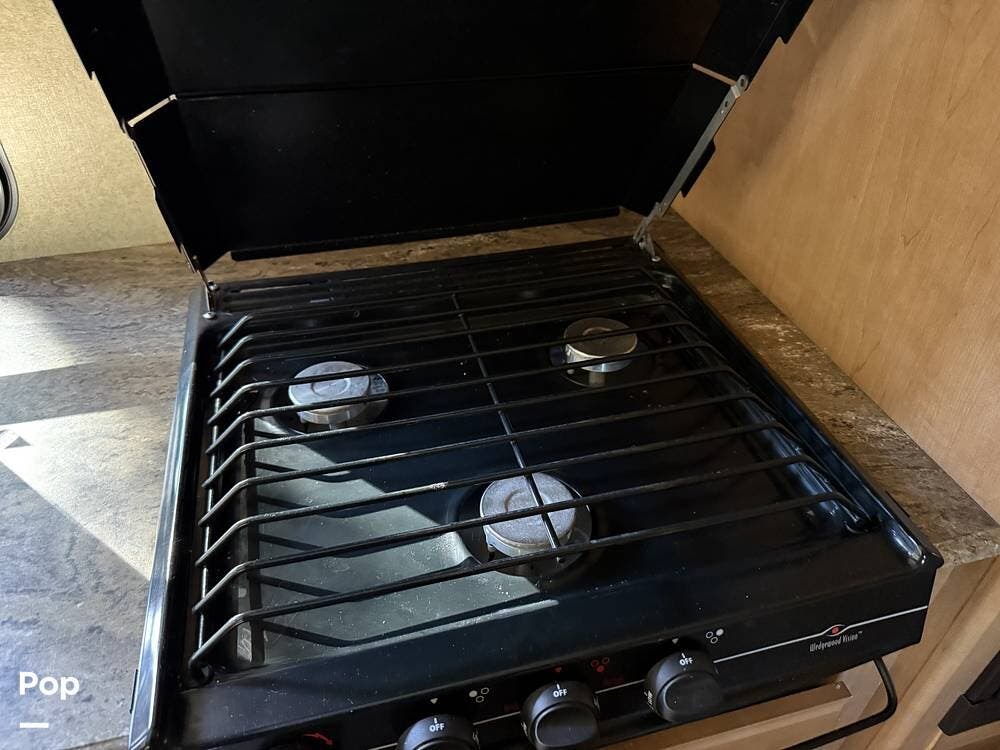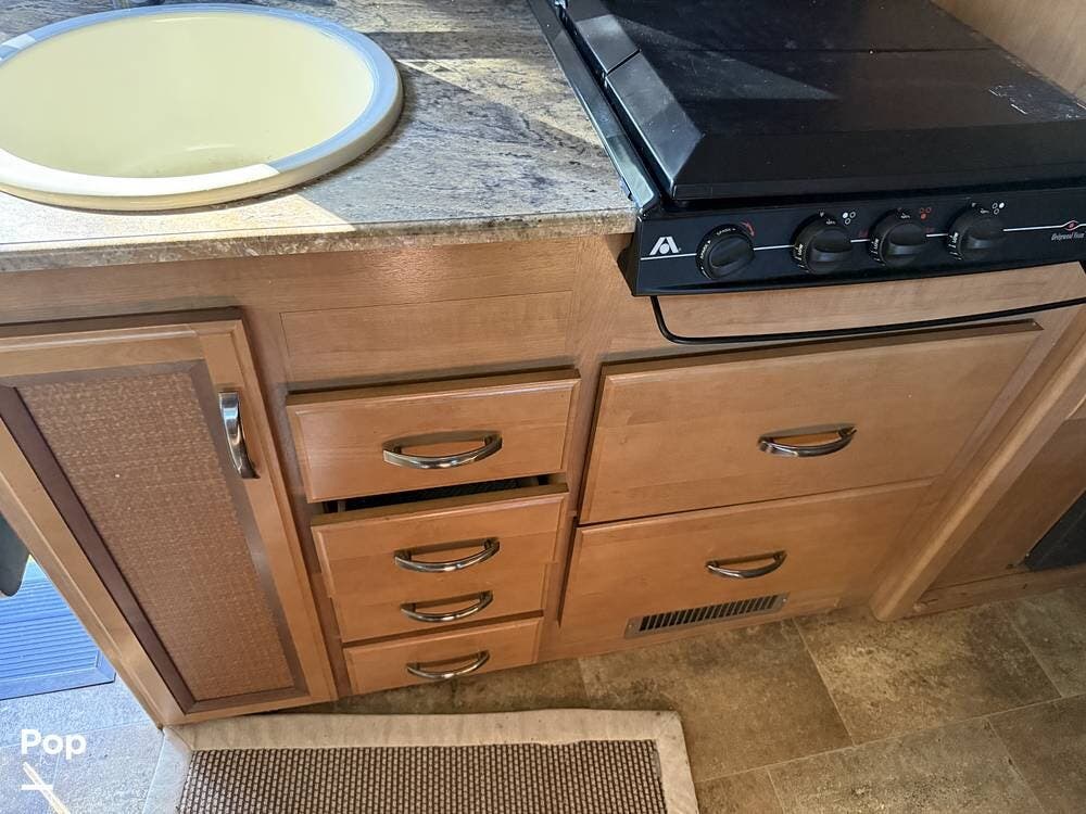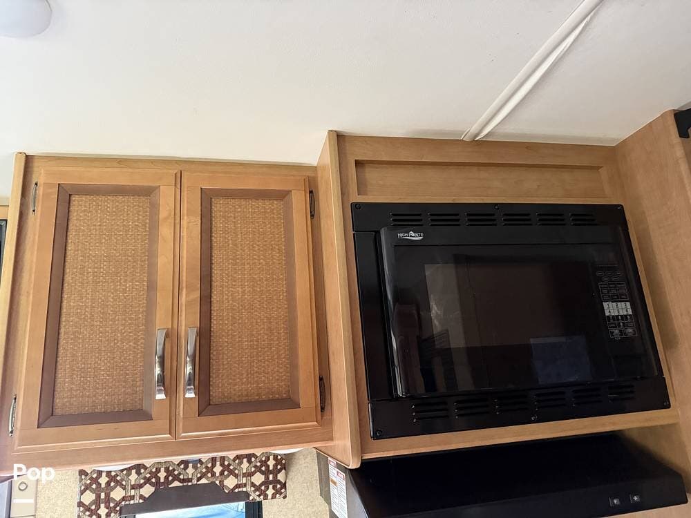 The kitchen in this Axis is compact yet fully functional, with everything needed to prepare meals on the road. It includes a dual-burner cooktop, convection microwave, refrigerator/freezer, and a sink with a high-rise faucet. Ample cabinetry above and below the counters offers room for cookware and pantry items, while the adjacent counter space makes meal prep easy. The layout keeps the kitchen accessible without intruding on the coach's main walkway.