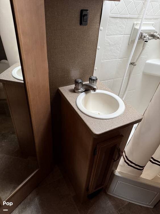 Mid-coach, the bathroom is thoughtfully designed for convenience and space efficiency. It features a full stand-up shower, foot-flush toilet, sink with countertop space, and a mirrored medicine cabinet. The central location makes it easily accessible from both the living area and the bedroom, ensuring privacy and practicality for all travelers.