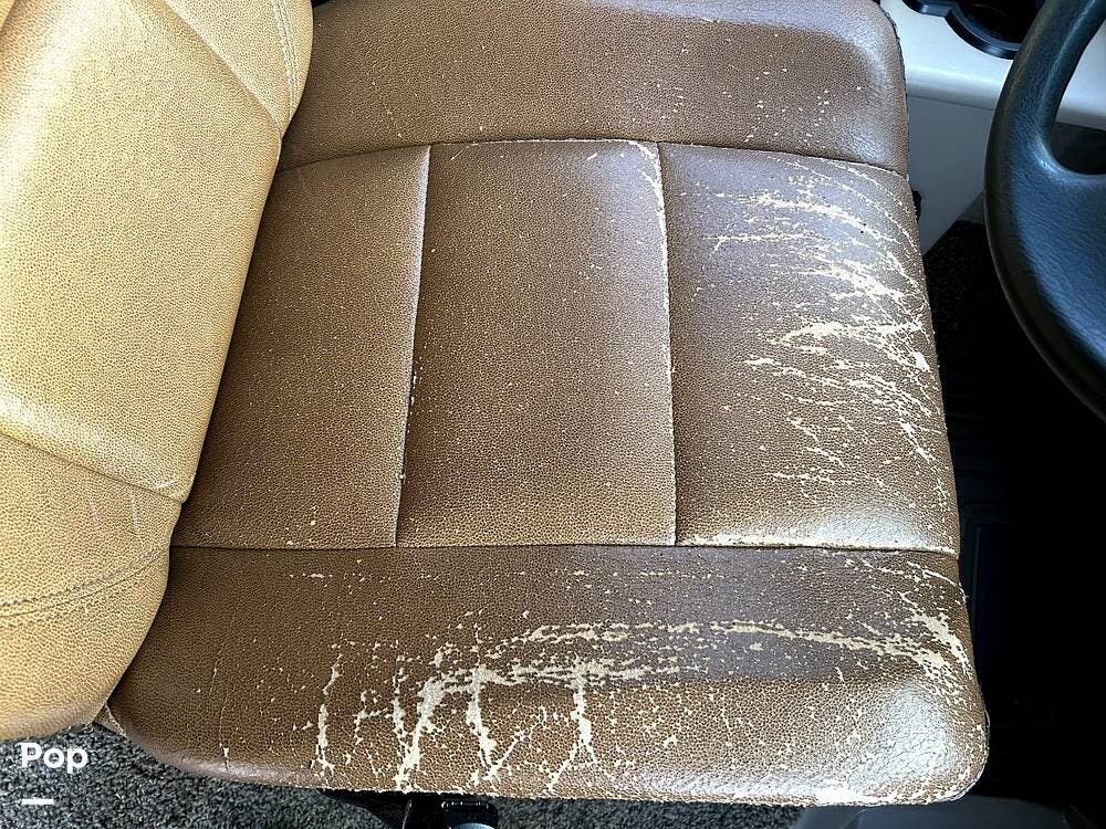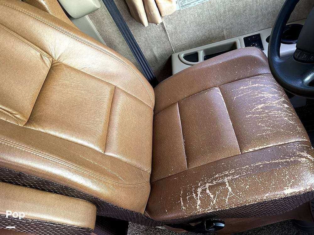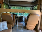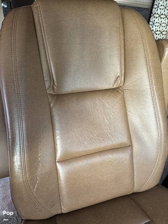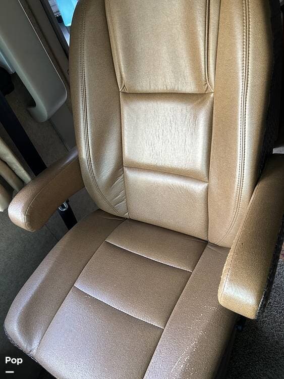 Up in the cab, you have privacy curtains on both sides as well as a power-front privacy blind. There is also a removable pedestal table between the driver and passenger seat just behind the touchscreen dash radio with a CD player, Bluetooth, DVD player, and backup/side camera monitor. The driver and passenger captain's chairs will recline and swivel and there is a passenger-side flip-up workstation/table, which is handy for a laptop, eating lunch, reading books, etc.