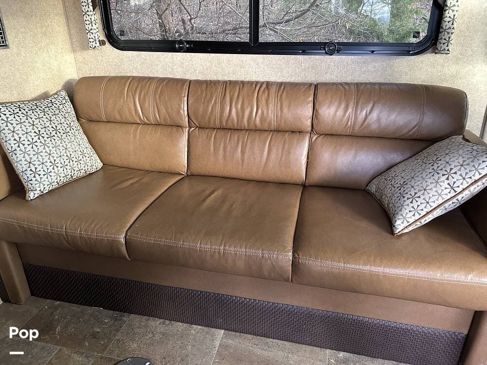 Inside there is a 32" LED TV overhead, a jack-knife sleeper sofa with overhead cabinets, and a removable pedestal table for mealtime. Above the cab area is a power drop-down overhead bunk.