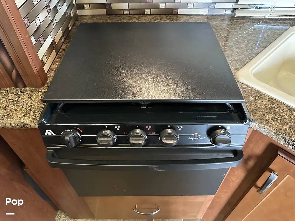 This unit features a refrigerator for easy access to refreshments while enjoying the great outdoors.
