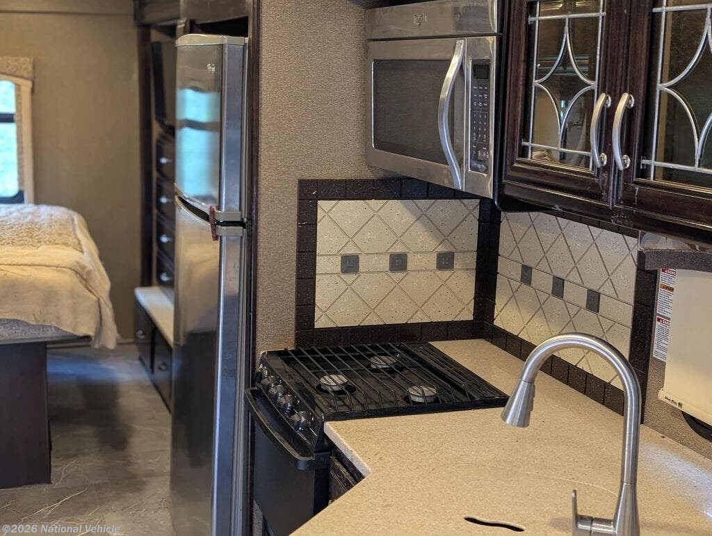 The main living area is thoughtfully designed with a comfortable sofa and dinette, both of which convert into additional sleeping space. The fully equipped kitchen offers solid-surface countertops, a three-burner cooktop, oven, microwave, double-door refrigerator, and ample cabinet storage?everything you need to prepare meals on the road.