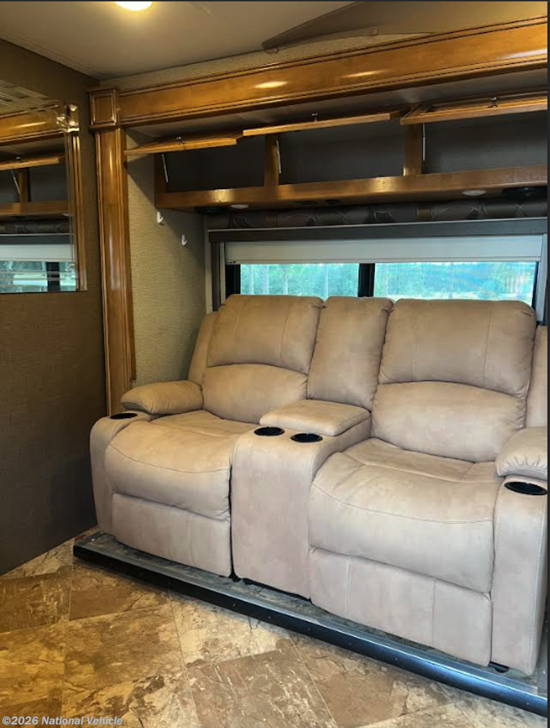 Step inside to find a warm, inviting living space accented by high-quality cabinetry, upscale fabrics, and refined detailing throughout. The dual-slide design creates a spacious living room ideal for relaxing or entertaining, while the private rear bedroom offers exceptional comfort and storage.
