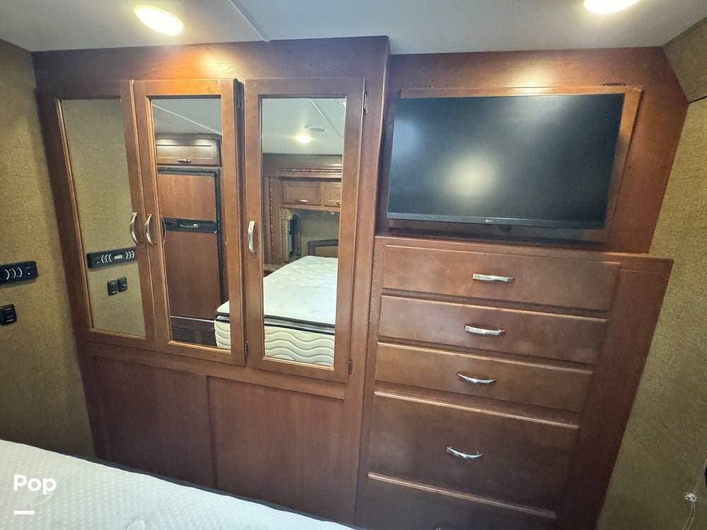 Interior amenities include a spacious living area, a bedroom wardrobe, a split full bathroom with a glass-enclosed shower and linens, an electric fireplace beneath a lift television, a radio, and a theater recliner sofa.