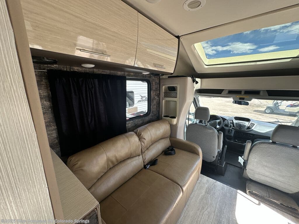 Enter in front behind the passenger seat and notice a 32" LED TV overhead. This can easily be viewed from the sofa opposite. There are two sets of seat belts for your rear travelers, and the sofa can easily be turned into a 42" x 64" sleeping space for on board campers or overnight guests. A removable pedestal table creates a nice dining space up front. Plus there is a built-in skylight over the cab area providing more natural light inside.