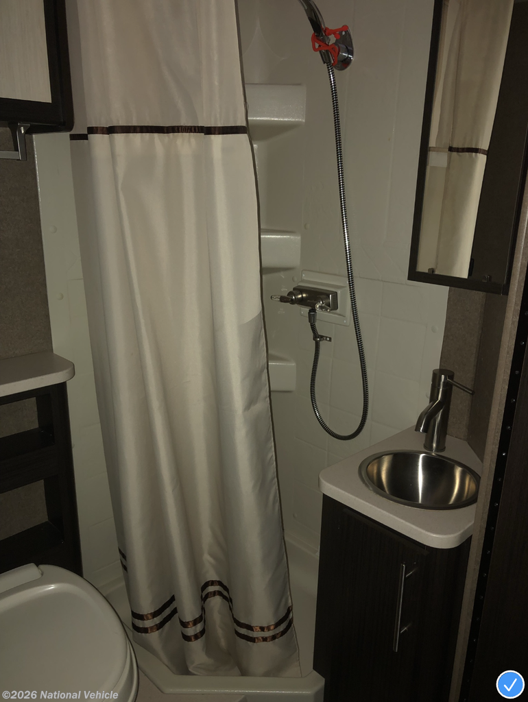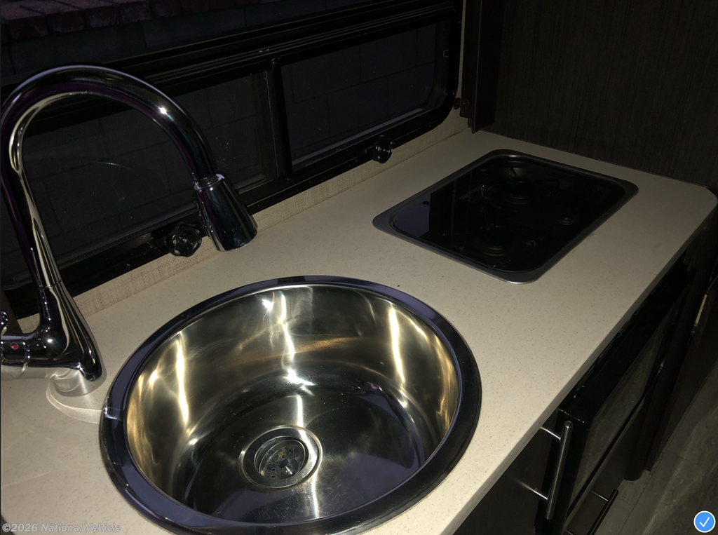 Kitchen: Includes a 2-burner cooktop, convection microwave, 3-way refrigerator (LP/12V/120V), sink, and overhead storage.