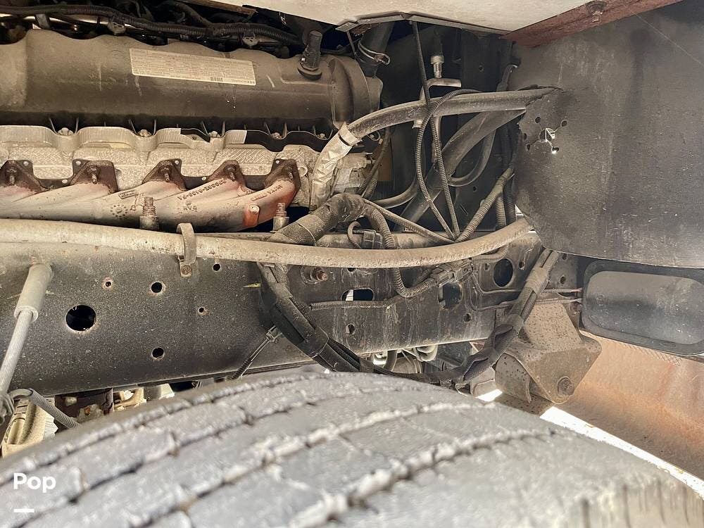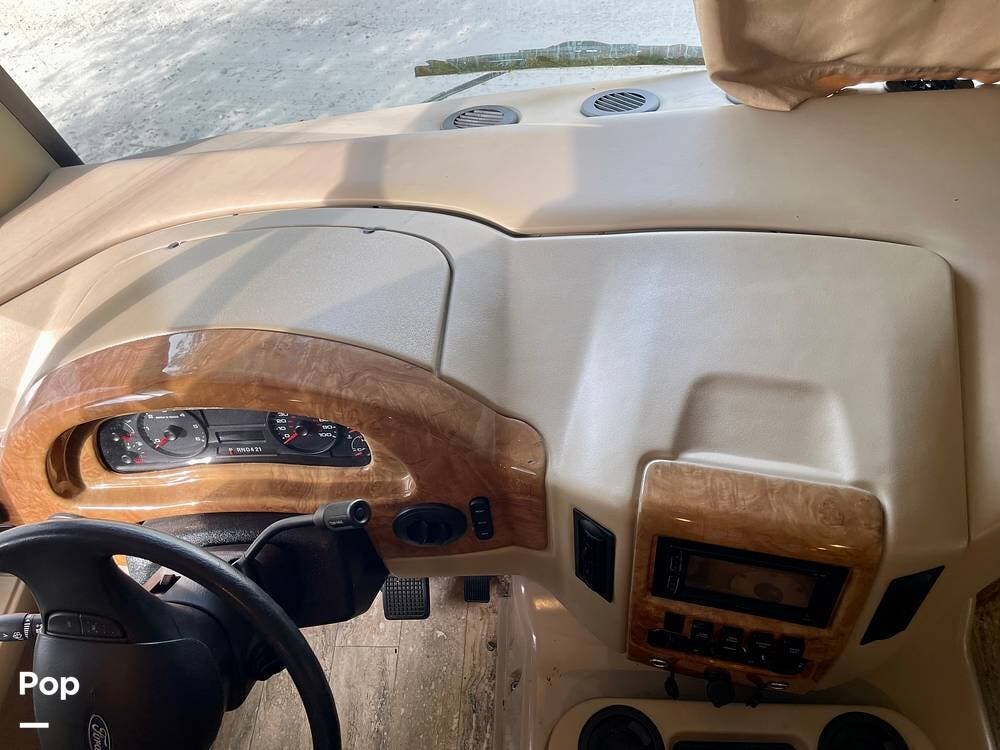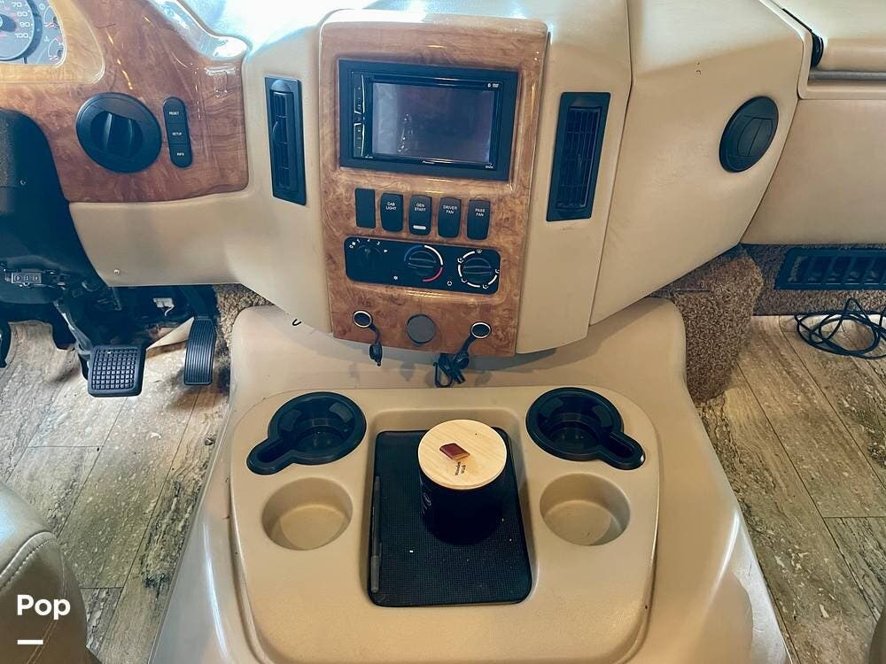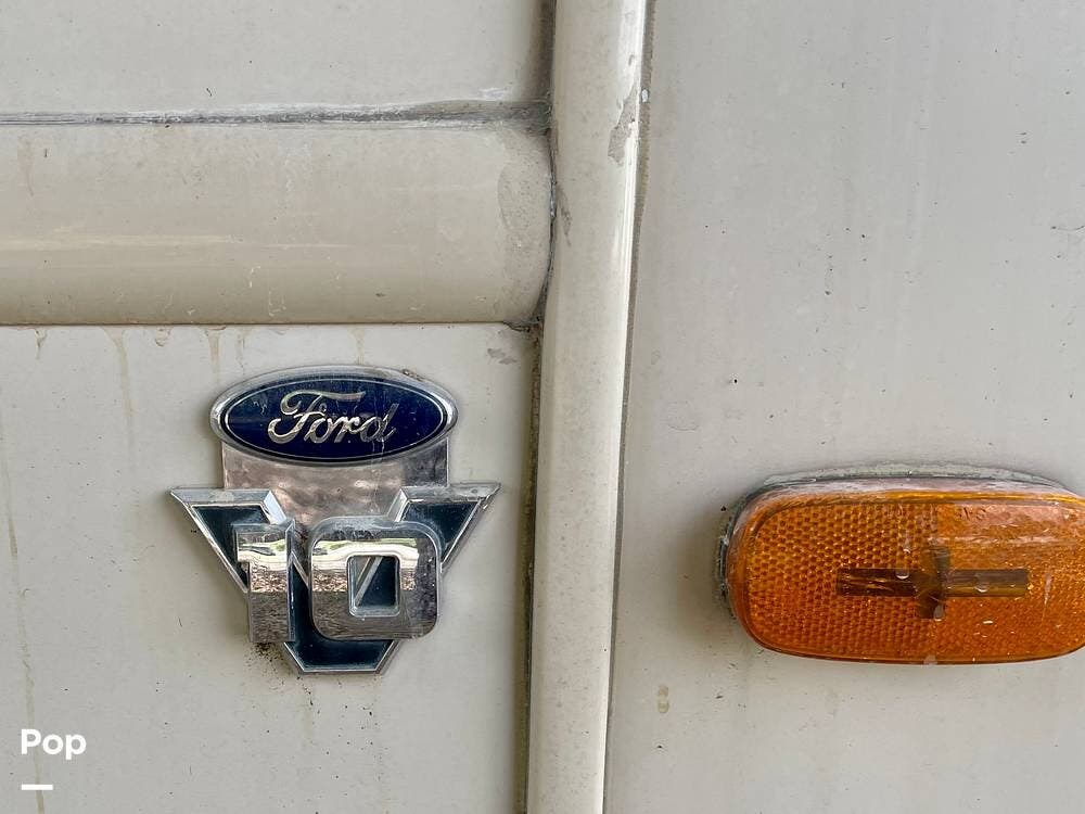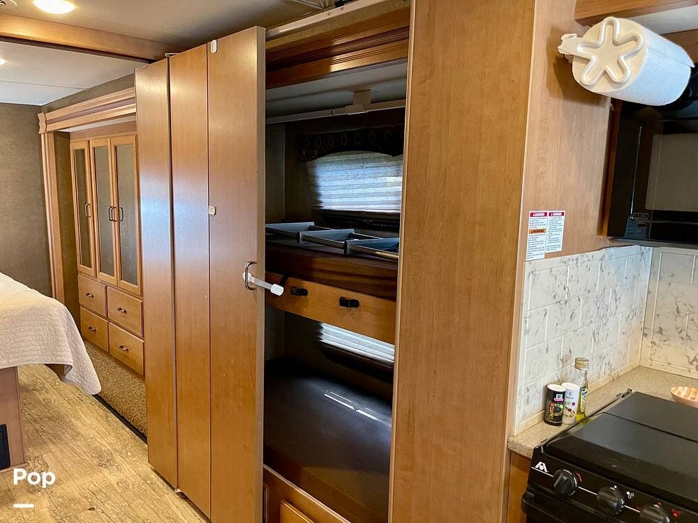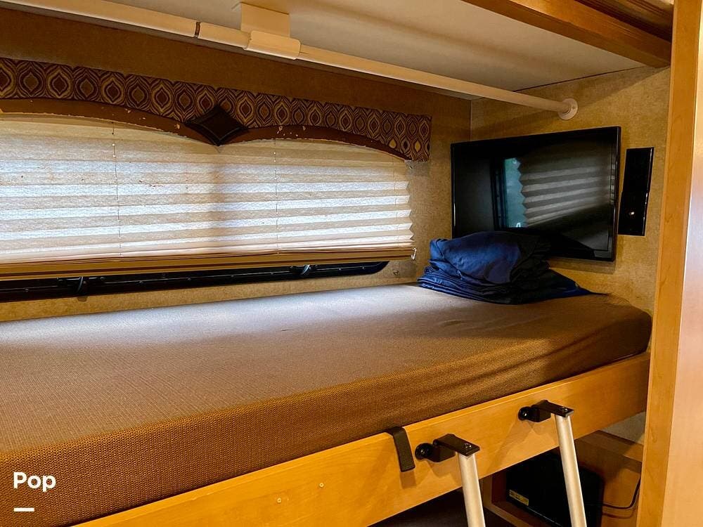 One of its standout features is the dual rear bunk beds, which provide a private, comfortable space, each equipped with its own TV for entertainment. The RV is built on a Ford F-53 chassis and powered by a Triton V10 engine, offering a smooth, reliable driving experience.