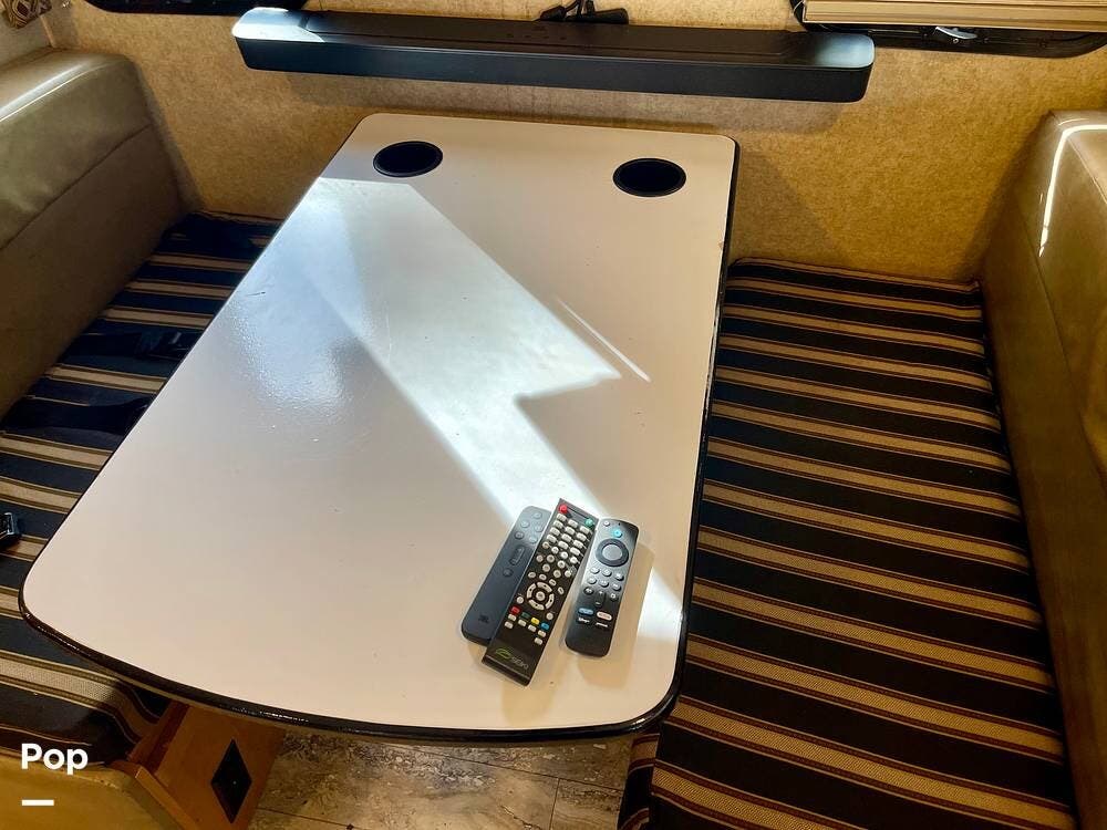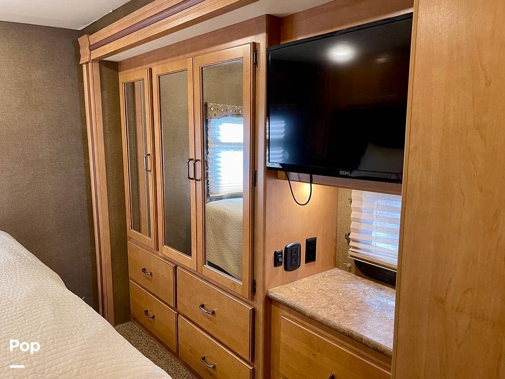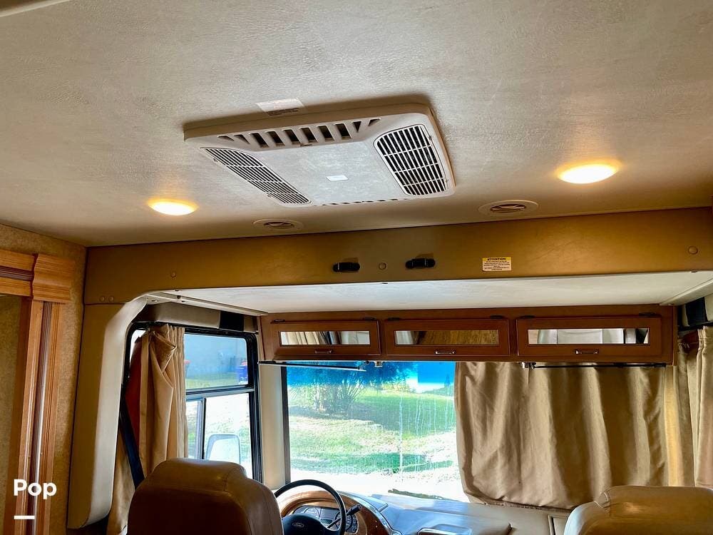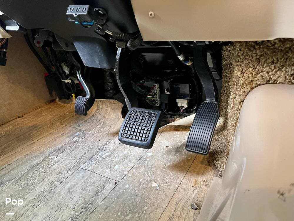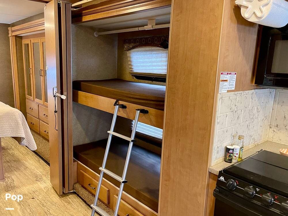One of its standout features is the dual rear bunk beds, which provide a private, comfortable space, each equipped with its own TV for entertainment. The RV is built on a Ford F-53 chassis and powered by a Triton V10 engine, offering a smooth, reliable driving experience.