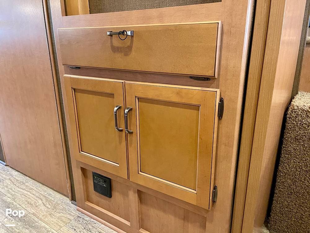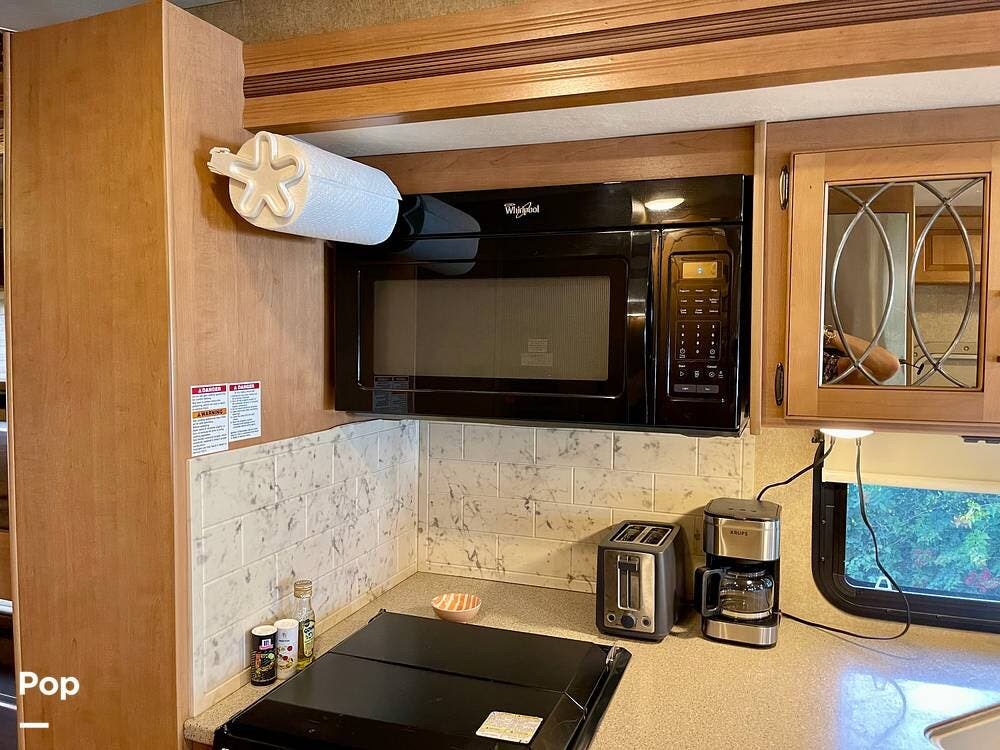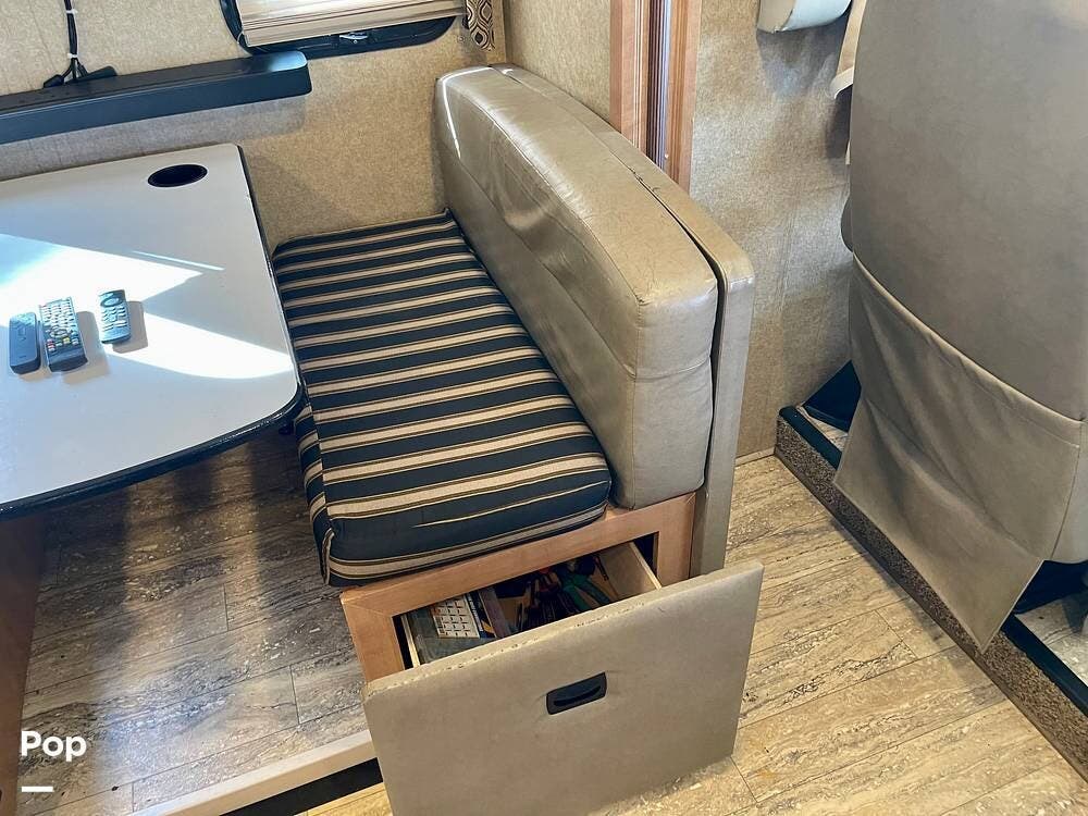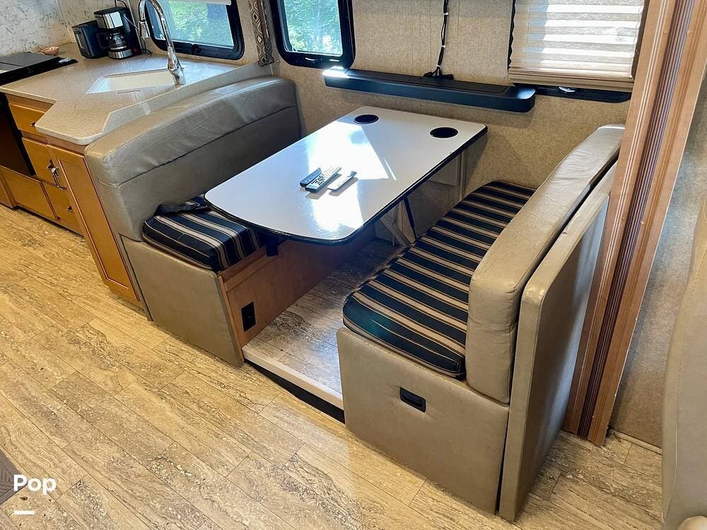 This Hurricane 34J is also known for its convertible living spaces. With retractable slide-outs, the RV expands to offer a spacious living and dining area, making it ideal for both relaxation and entertaining. The cabover bunk above the driver's seat easily folds down to provide additional sleeping space. At the same time, the dinette and sofa can also be converted into beds, ensuring that everyone has a place to sleep.