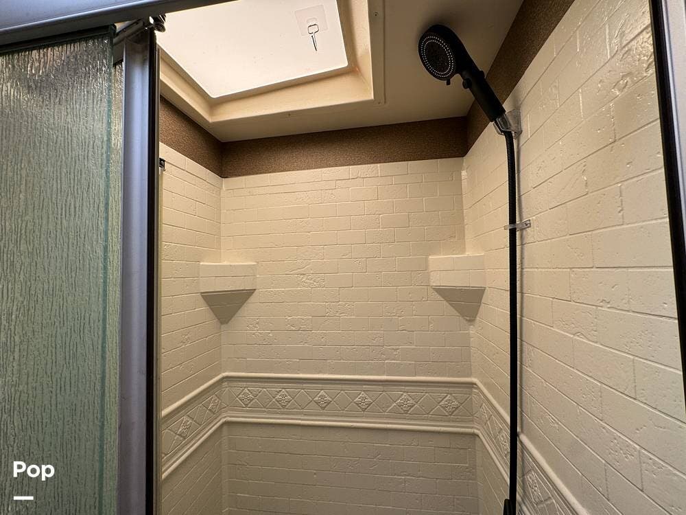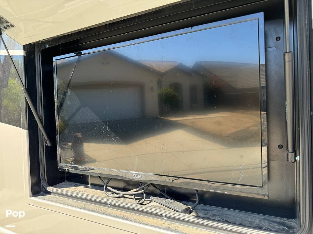 A 10-gallon water heater ensures hot showers, and there's an external TV for outdoor entertainment.