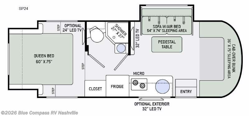 As you enter this model, above the cab you will find a 36" x 75" sleeping space for one adult or the kiddos may need to draw straws for. The slide located behind the driver's seat has a sofa with an air bed and a pedestal table. At night the sofa converts into additional sleeping space. Adjacent to the slide you can enjoy watching a 32" LED TV.