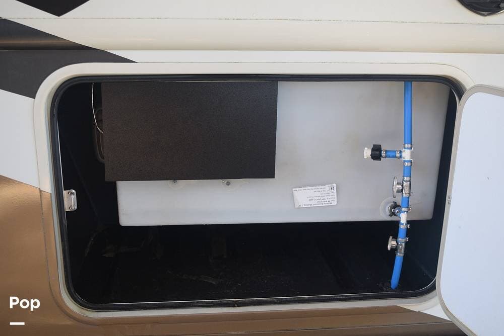This RV features an outside entertainment area with a TV and speakers, as well as an outside kitchen area equipped with a mini refrigerator, sink, and a quick LP quick connect for a grill.