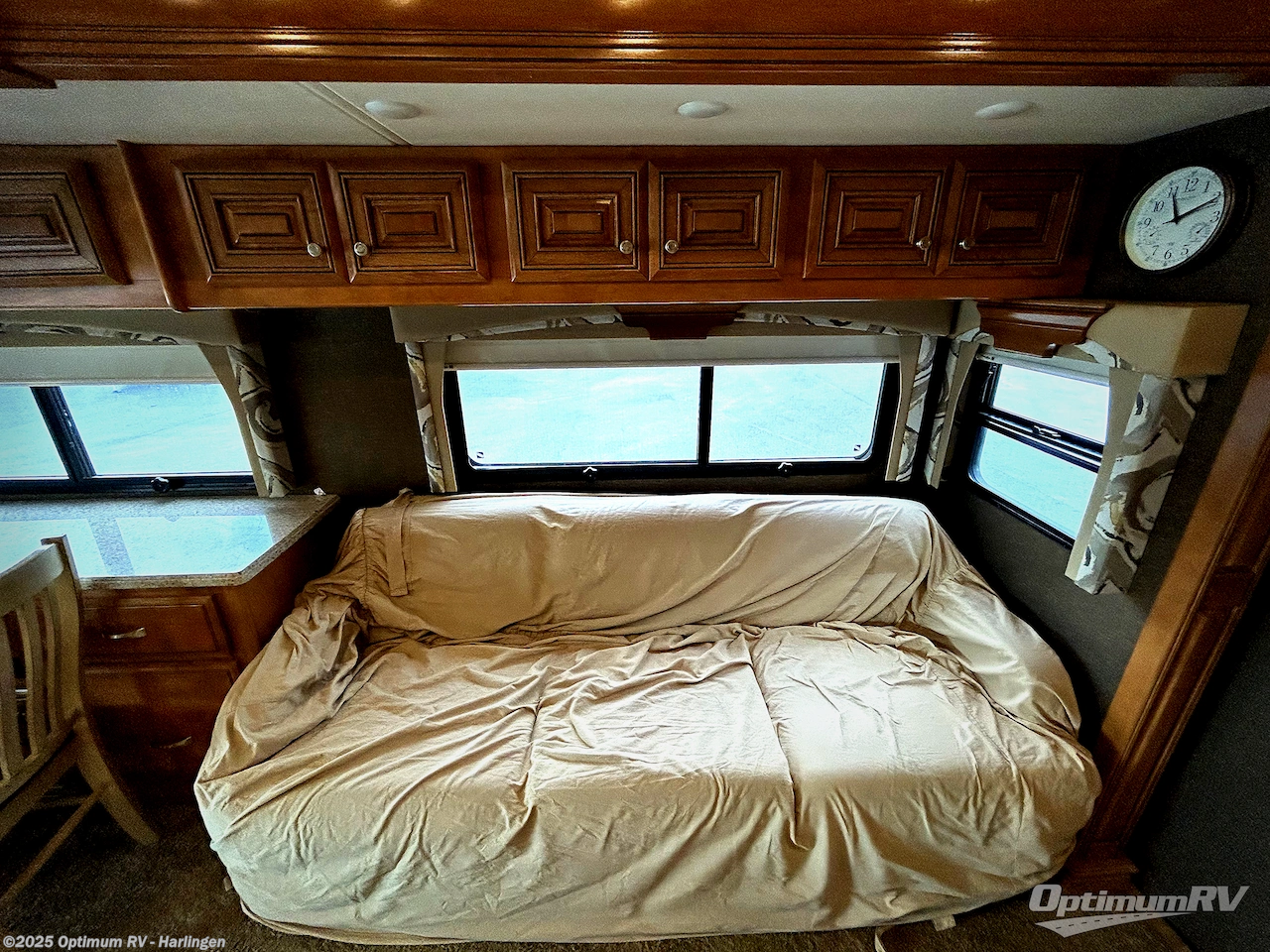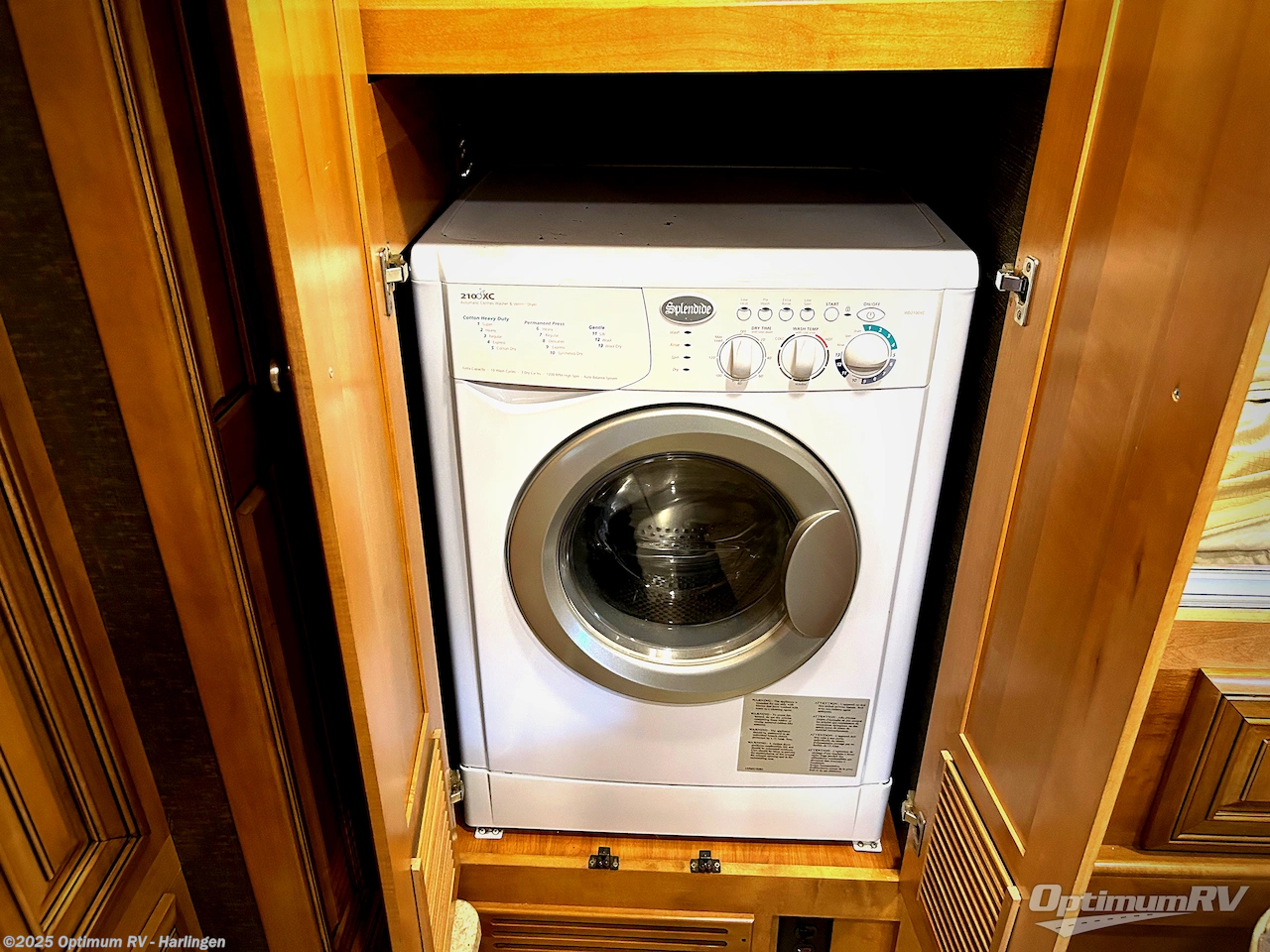A rear bedroom offers a king bed in a slide with nightstands at each side and overhead cabinets. The rear wall holds a large wardrobe and a corner washer/dryer. The wall opposite the bed includes a dresser, closet, overhead cabinet, and a 32" LED TV within a slide out.