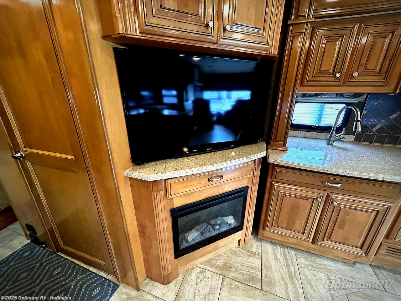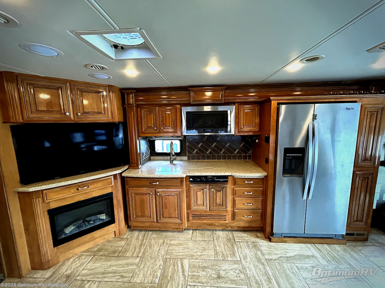 The opposite side in the living area includes a corner linen storage area, with a 48" LED TV and fireplace. A slide has a double sink, three burner range, overhead microwave, overhead cabinets, pull-out countertop section, a refrigerator and a pantry.
