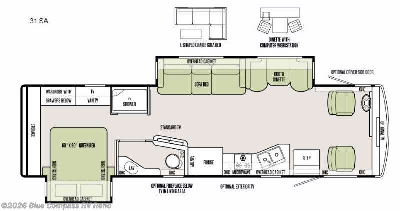 As you enter the coach, the front includes two captain's chairs, overhead cabinets at each side, an optional TV at the center front and an optional driver side door.