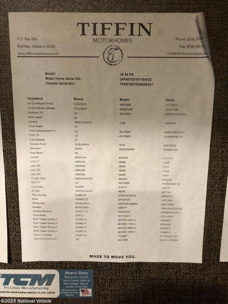 Additional features include a 7.0kW Onan generator, hydraulic leveling jacks, dual A/C units, central vacuum, backup and side-view cameras, power patio awning, and pass-through basement storage. Tiffin?s attention to detail, like hardwood cabinetry, insulated sidewalls, and high-end fixtures, makes this coach a standout in its class.