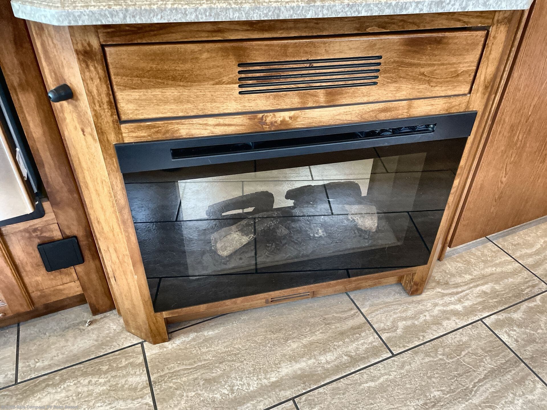 An entertainment center on the outside bathroom wall includes a standard TV and an optional fireplace below the TV.