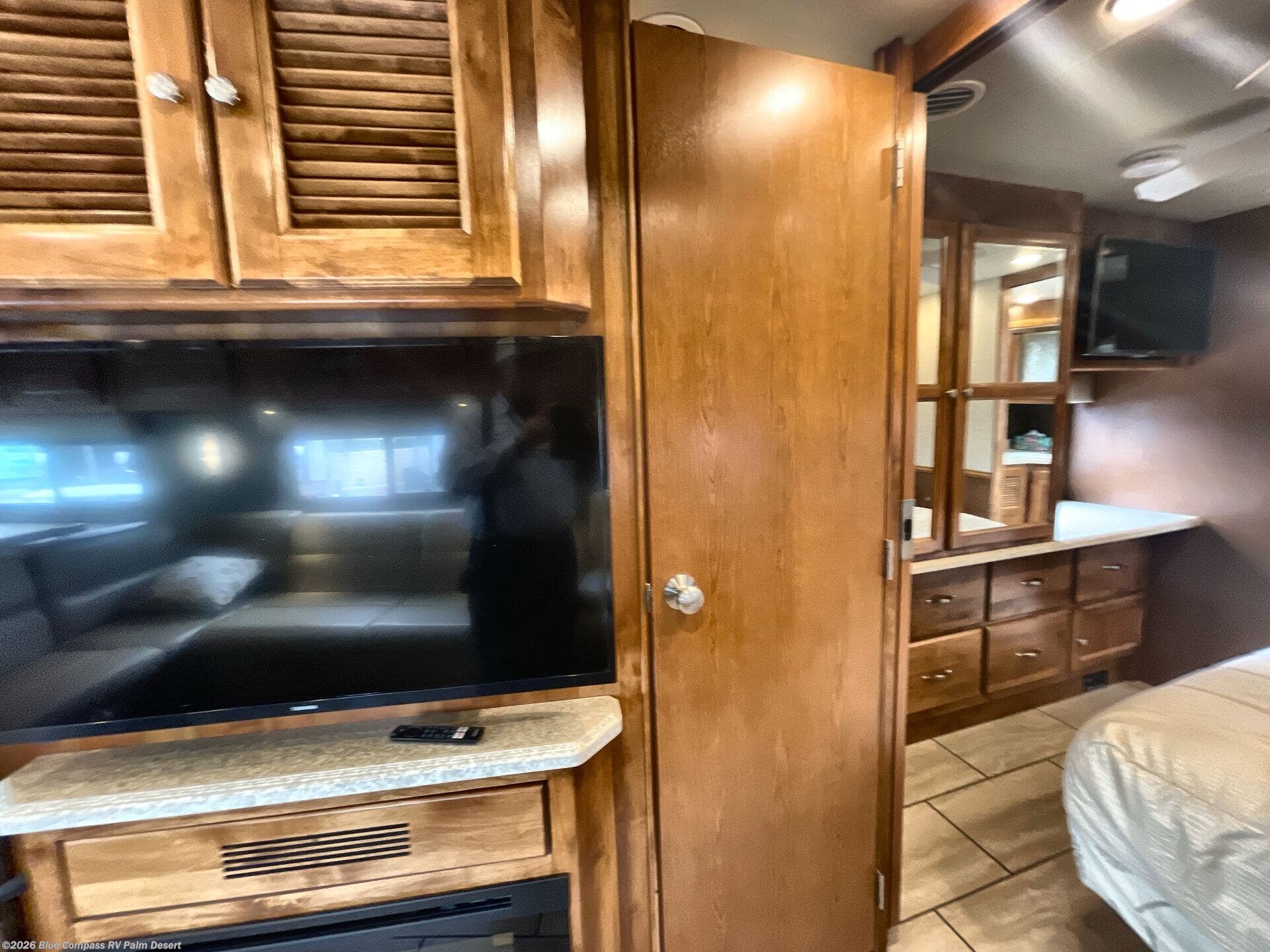 The private bedroom includes a queen bed slide with nightstands at each side and overhead cabinets. The wall opposite the bed includes a wardrobe with drawers below as well as a vanity with a TV and overhead cabinets above.