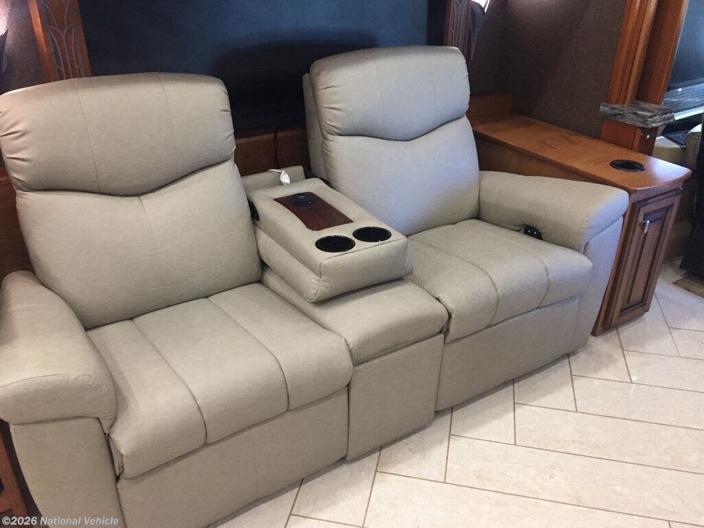 Inside, this motorhome features elegant touches and functional design. The floor plan includes a full bath and a half, providing separate zones for comfort and convenience. The front living area opens up thanks to the slide?outs, offering a sofa, dinette or workstation area, and entertainment center with TV and fireplace options. Up front is the driver?s cockpit with plush seating and full dashboard amenities, while toward the rear is a private master bedroom featuring a king bed, wardrobe space, and typically in?suite access to the main bath. The galley includes solid surface countertops, full?size residential appliances (in many units), and ample storage to support extended stays.
