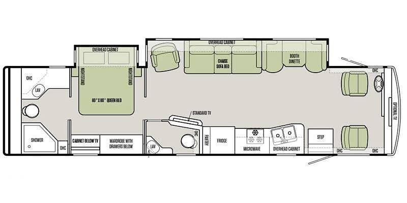 This Allegro features a Ford Chassis and is powered by a Ford V-10 6.8L gas engine, paired with a TorqShift 5-speed transmission.
