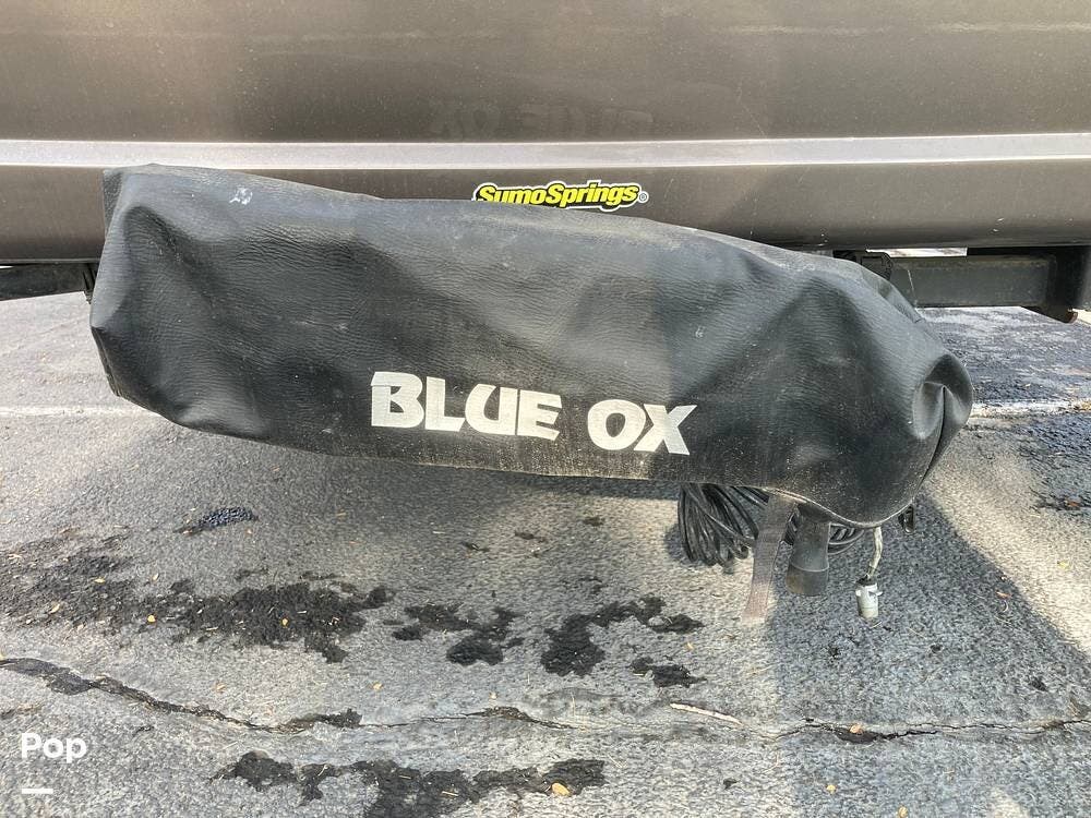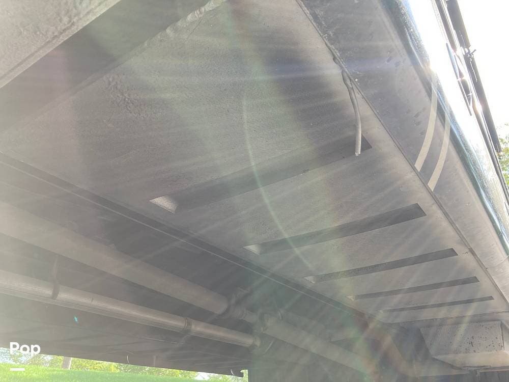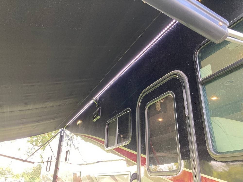 The exterior features two slides, a 20-foot electric awning, several storage compartments, a propane generator, a huge propane tank, roof vent covers, a Blue Ox tow bar package, electric extending steps, newer batteries, a roof ladder, two roof air conditioners, and an outside HDTV.