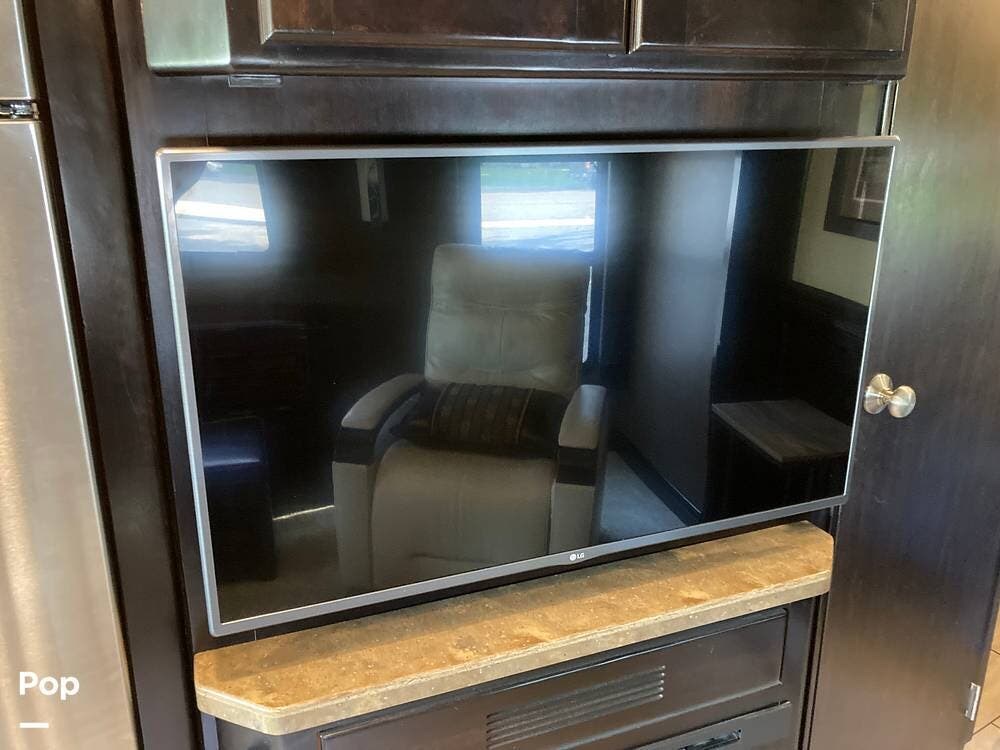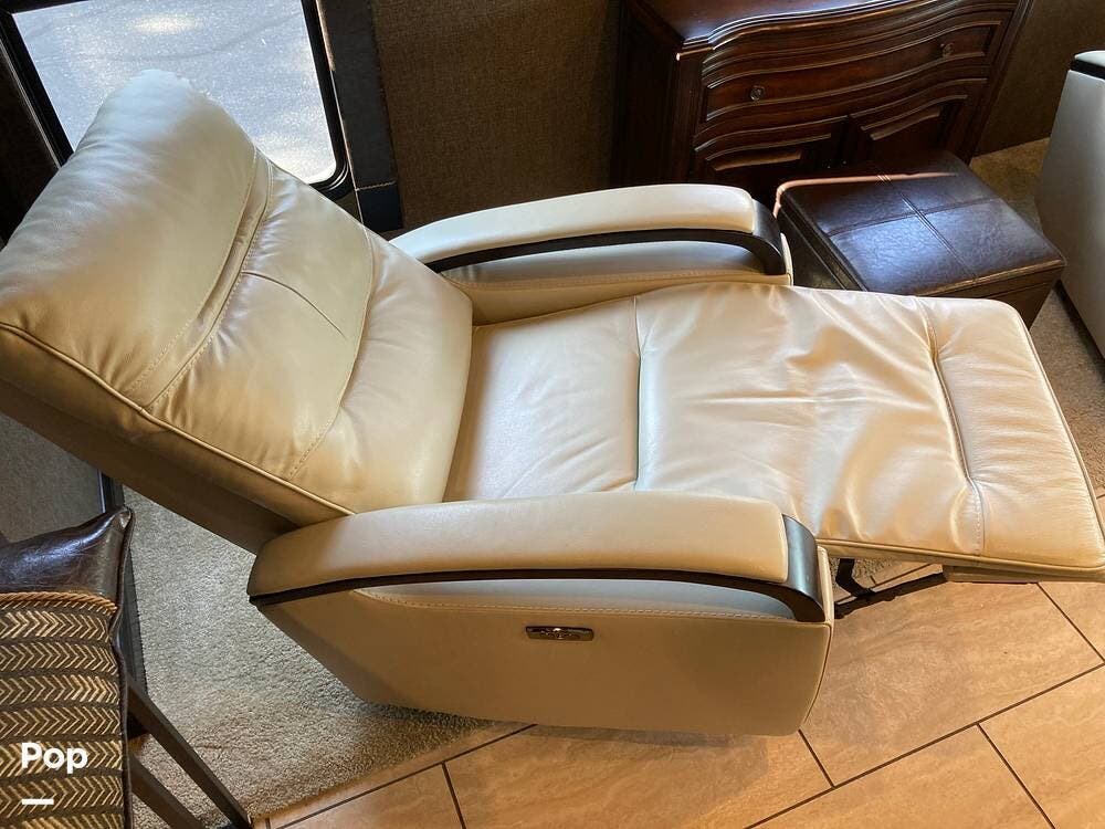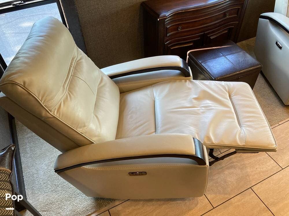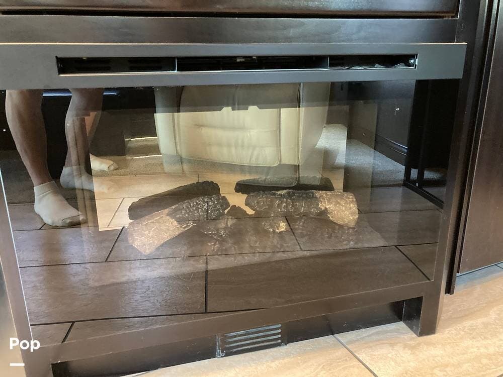 The living area features a fireplace, a huge HDTV, two newer power recliners that swivel, a newer sofa with a pull-out queen bed, ample overhead storage, and a central vacuum system.