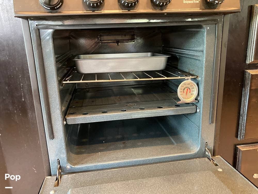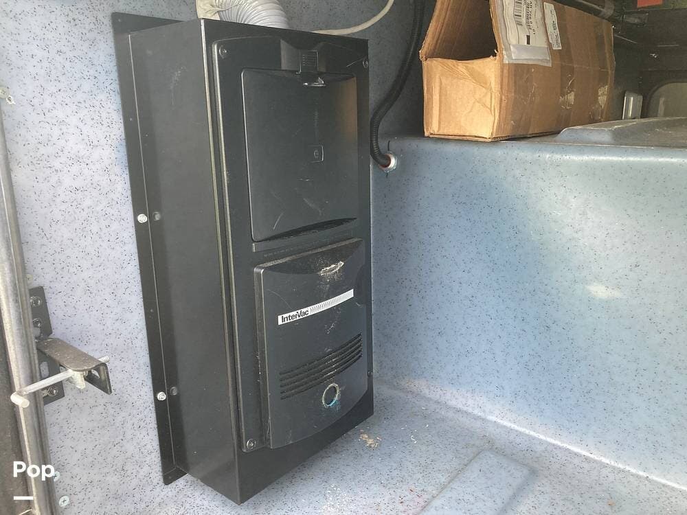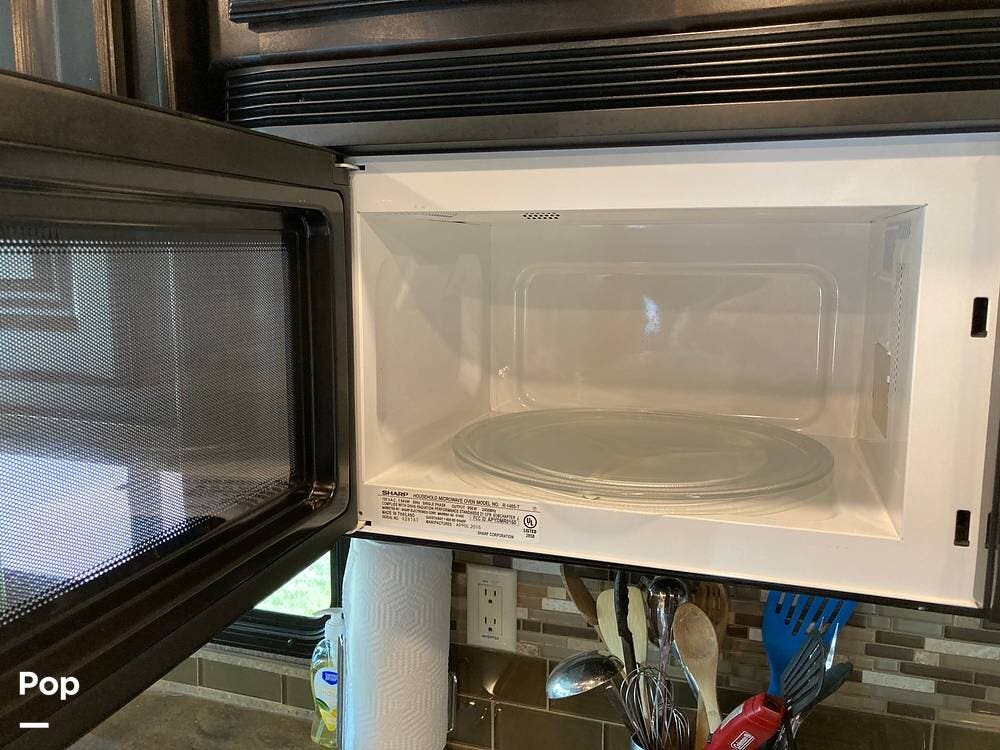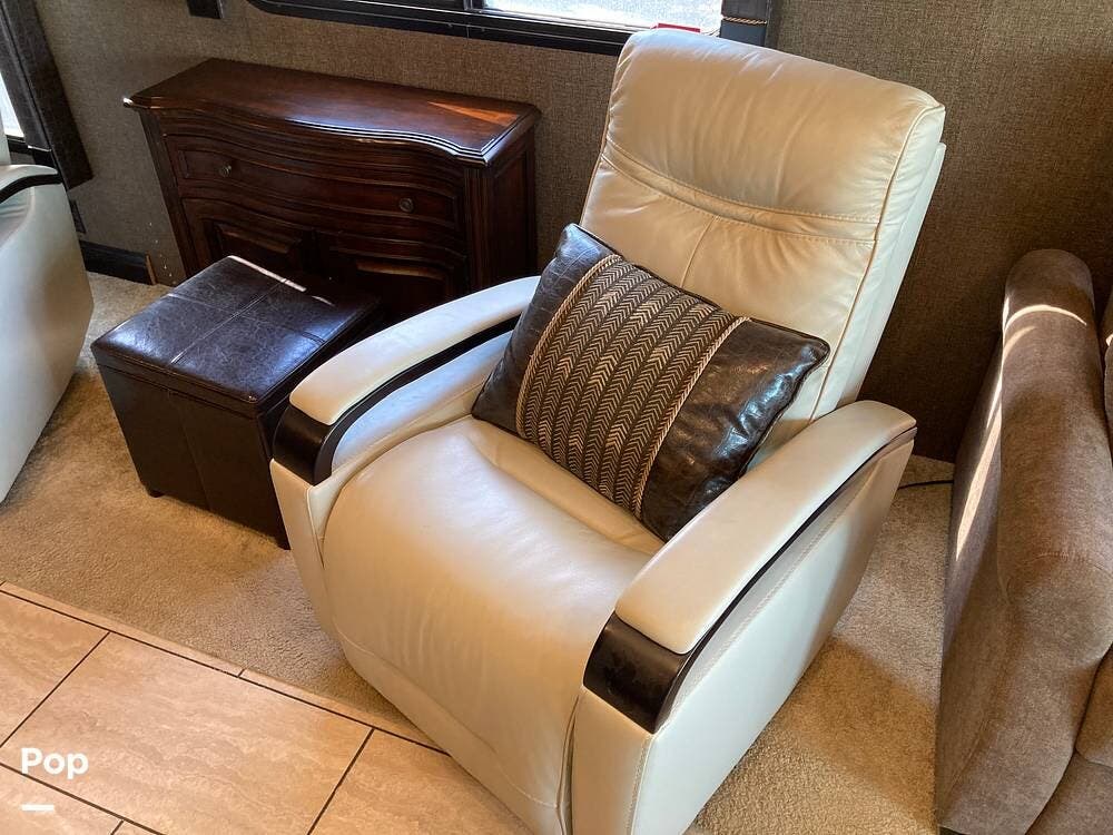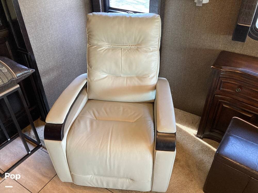 The living area features a fireplace, a huge HDTV, two newer power recliners that swivel, a newer sofa with a pull-out queen bed, ample overhead storage, and a central vacuum system.