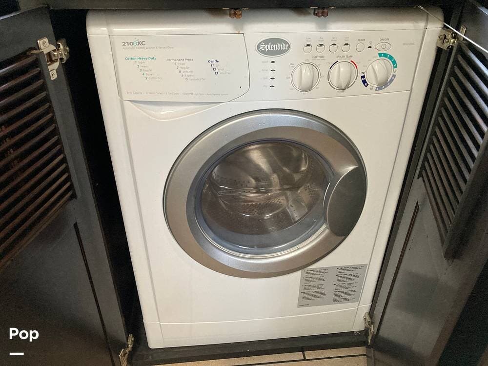 The master bath has a comfortably sized shower, an adjustable wand, a seat, and a skylight with a sliding closure door. Also features a vanity sink, electric toilet, linen cabinet, and drawers. The washer/dryer combination is conveniently located here.