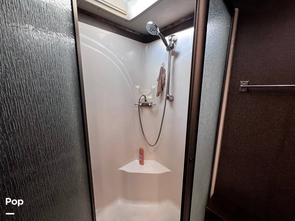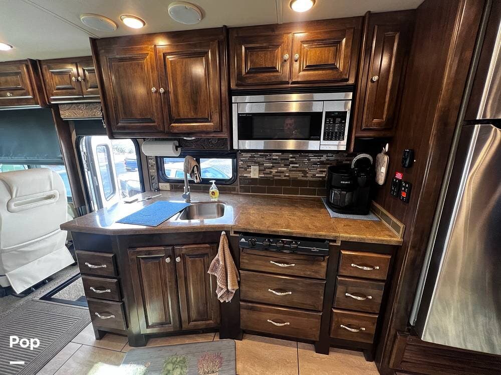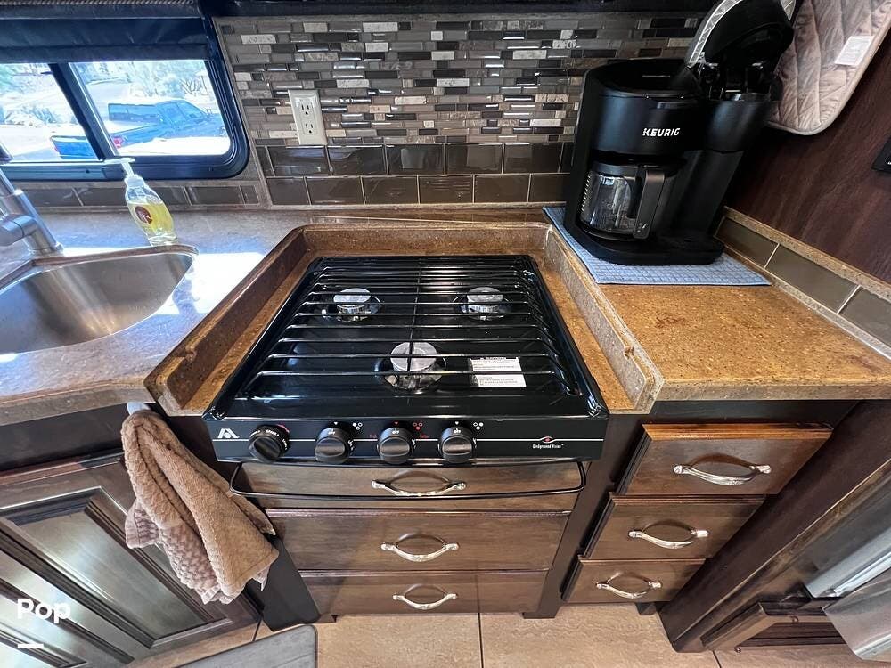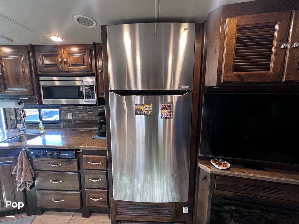 The interior offers ample storage cabinets. The kitchen is equipped with all the necessary features to prepare meals while on the road. The fridge/freezer is full-sized.
