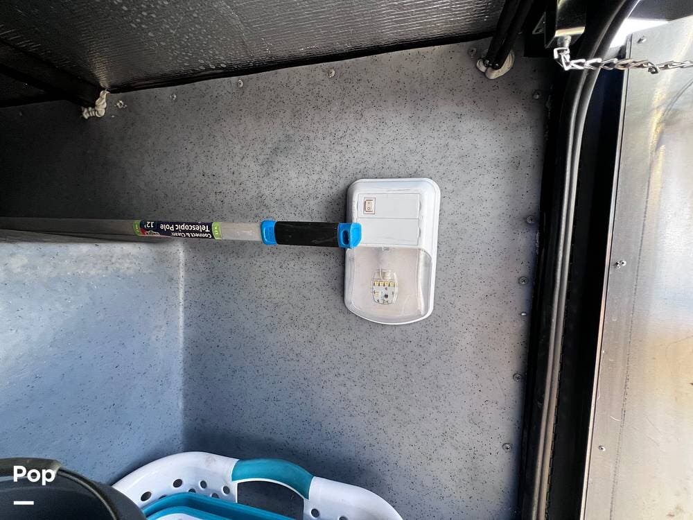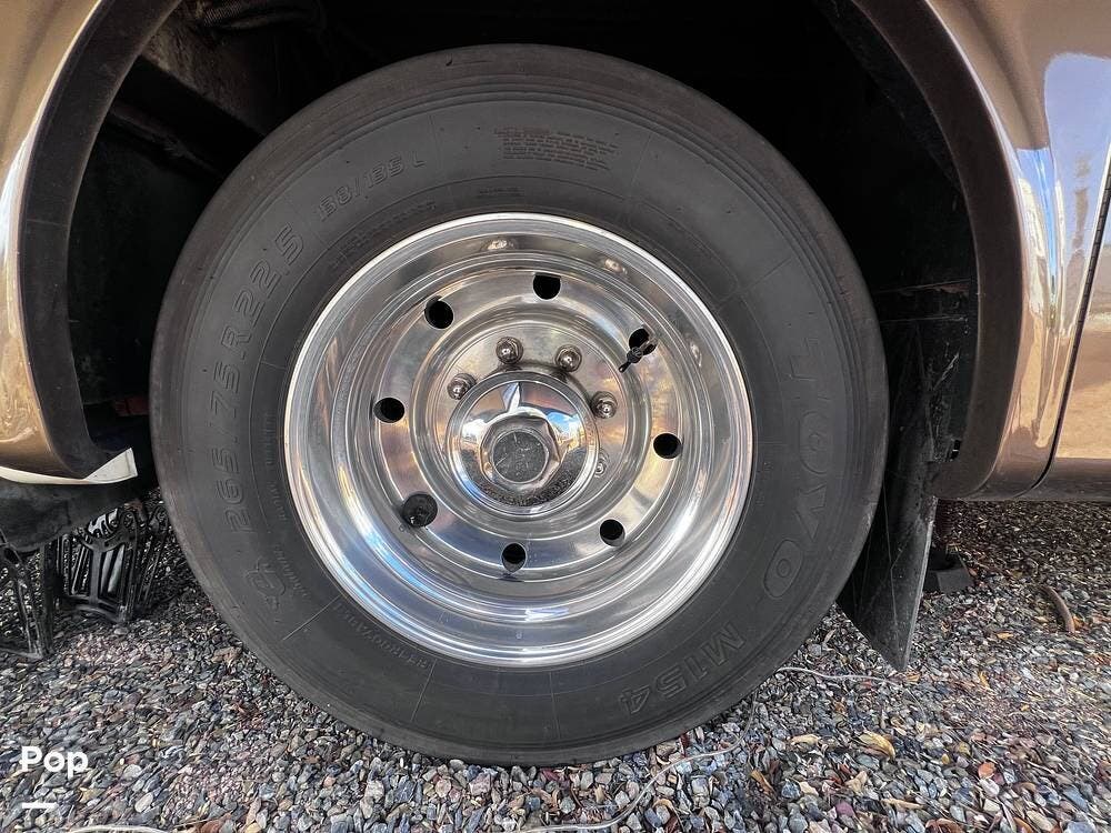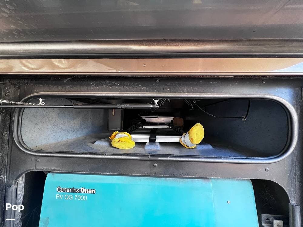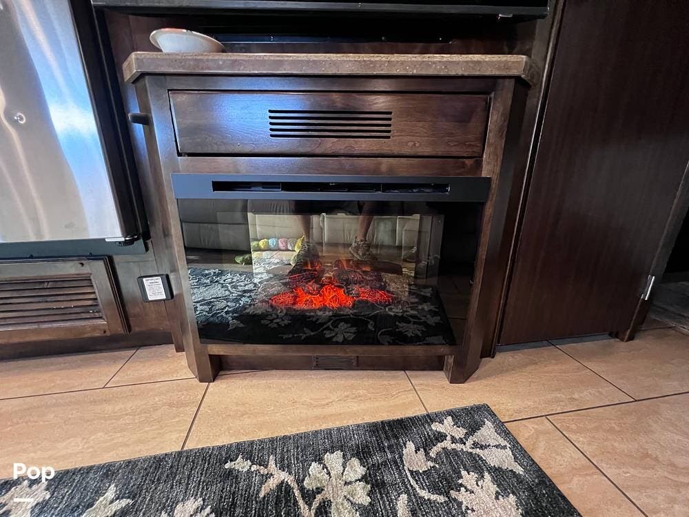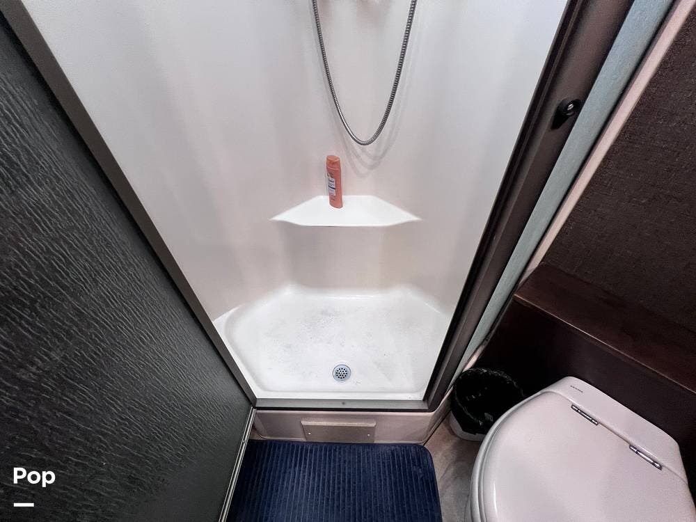 The interior offers ample storage cabinets. The kitchen is equipped with all the necessary features to prepare meals while on the road. The fridge/freezer is full-sized.