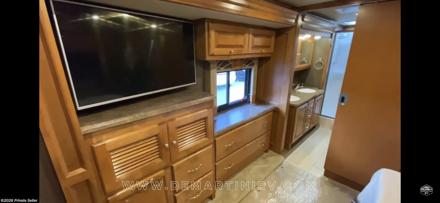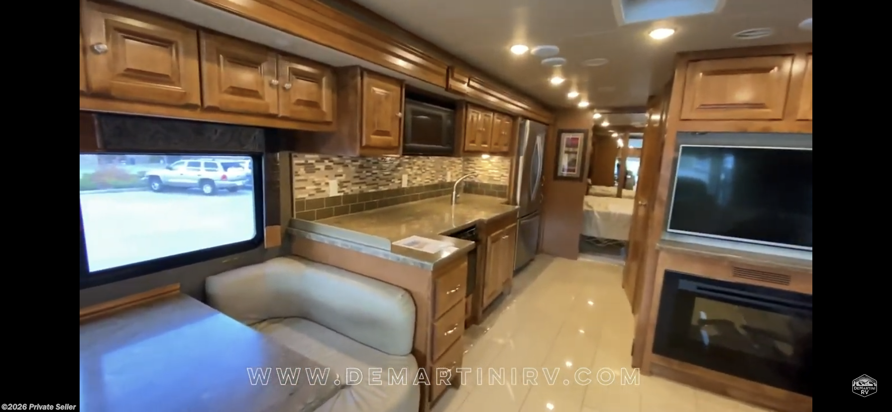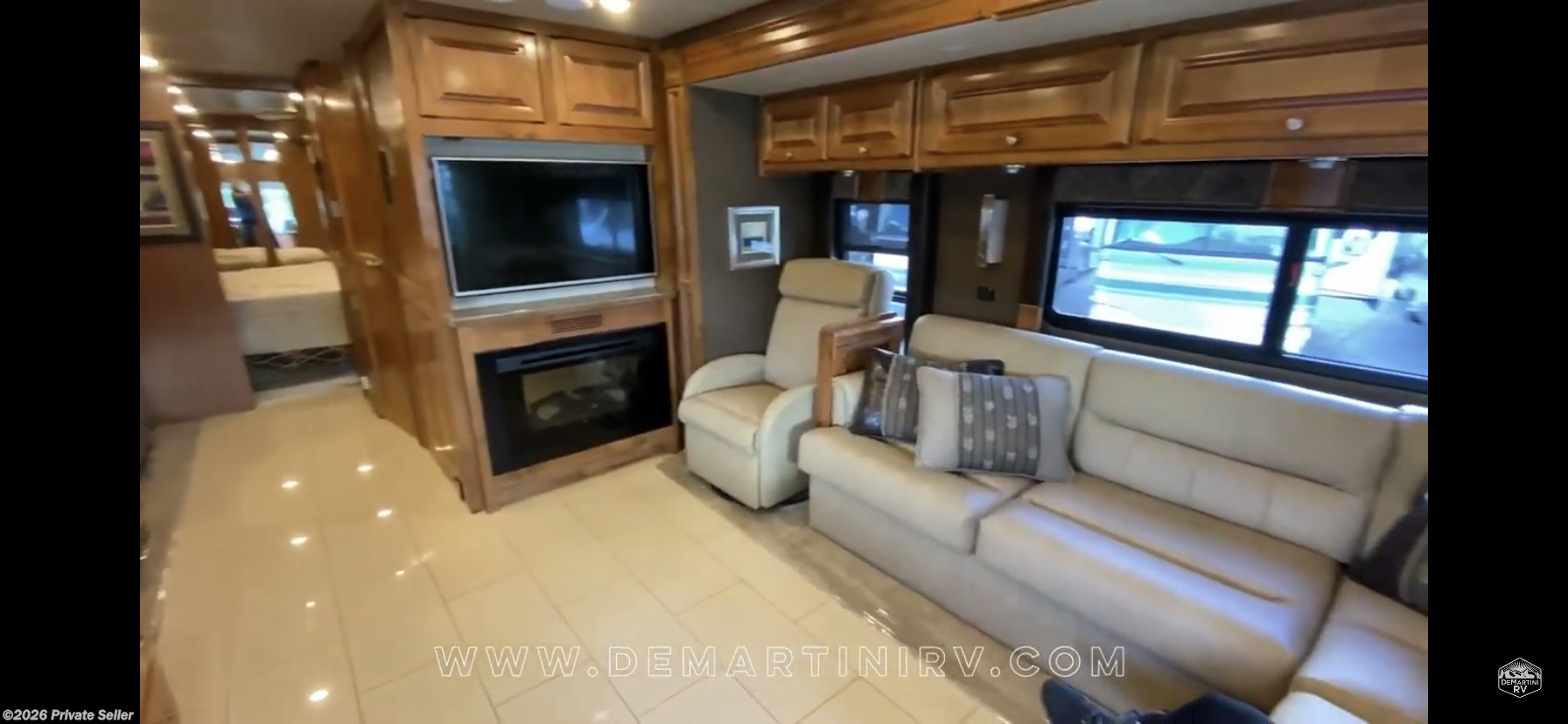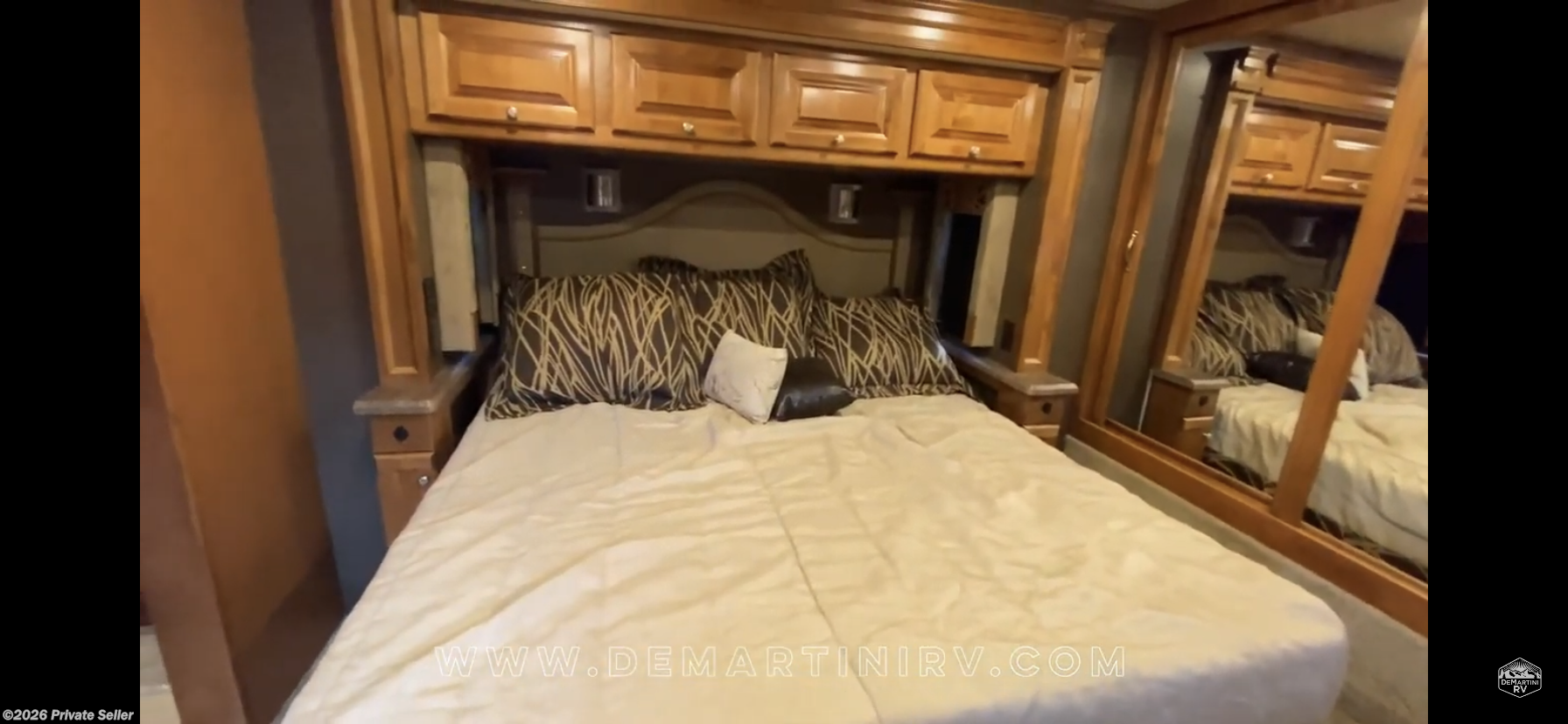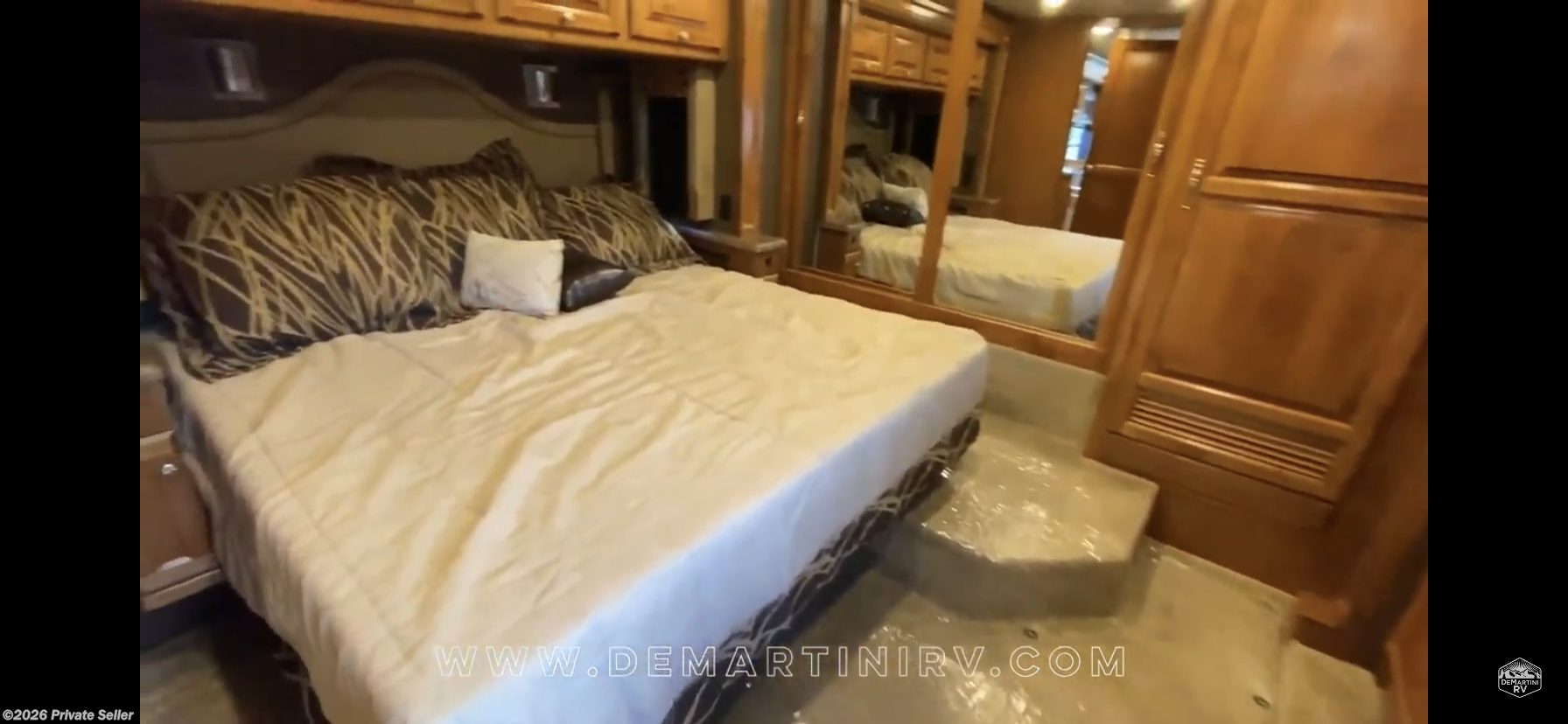 The kitchen is fully equipped with solid surface countertops, a residential refrigerator, convection micorwave, three burner cooktop, and ample storage(with pantry), allowing for easy meal preperation while traveling. Toward the rear, the master bedroom offers a king-size bed, large wardrobe storage, and optional washer/dryer, along with a spacious bathroom that often features dual sinks and a large shower for added convinience.