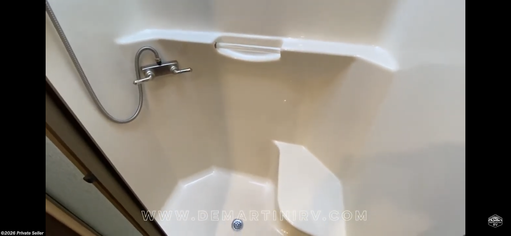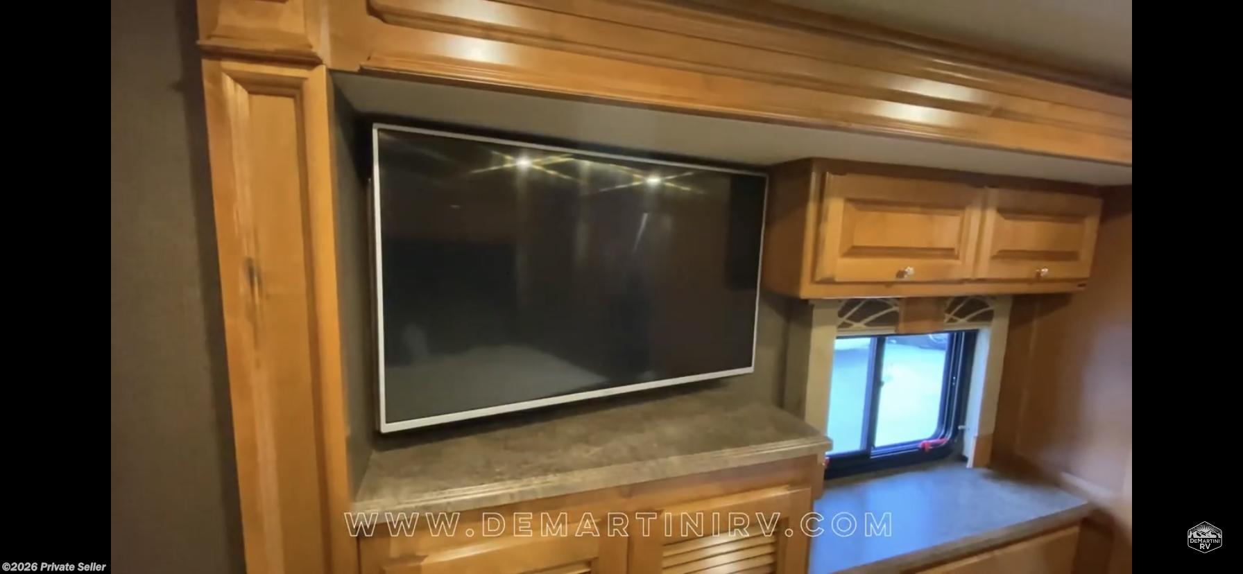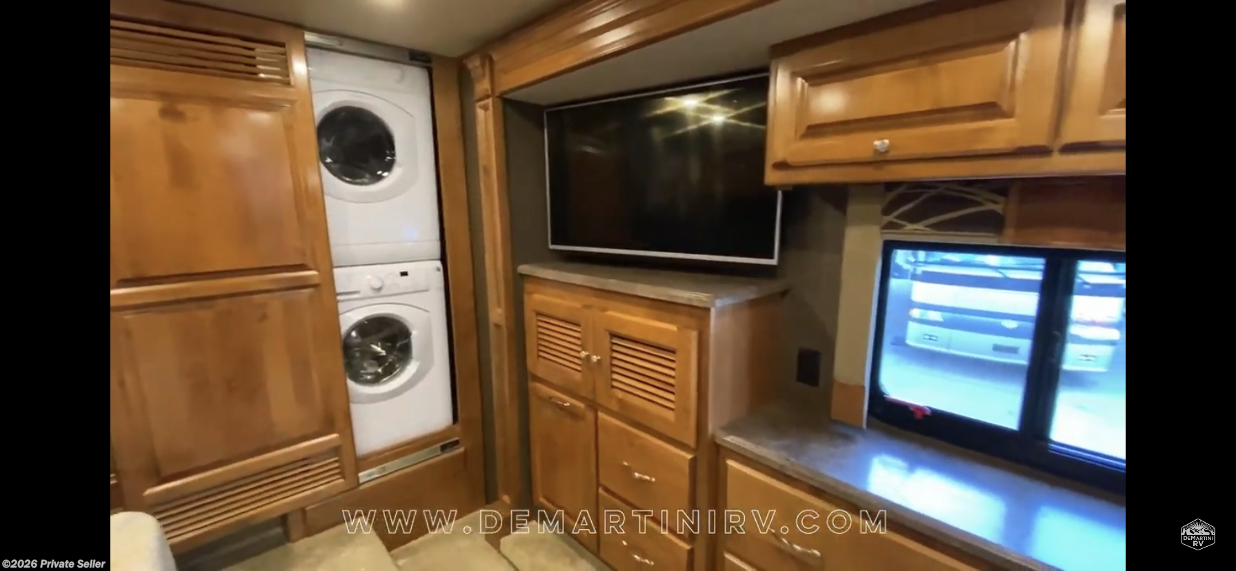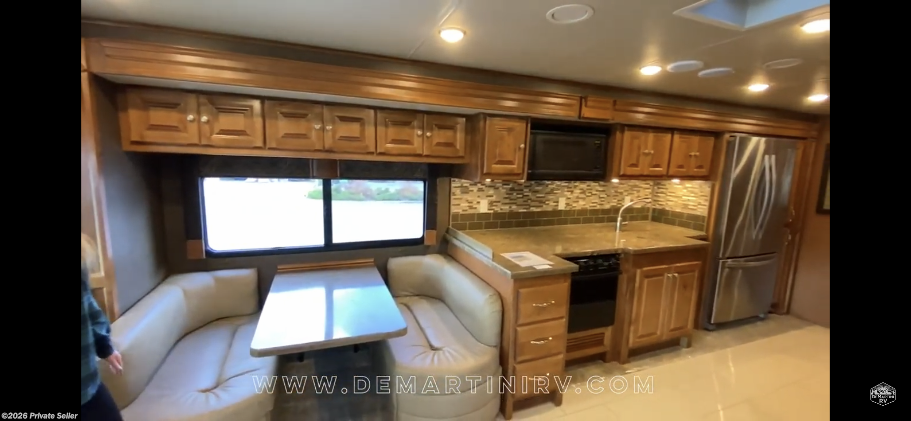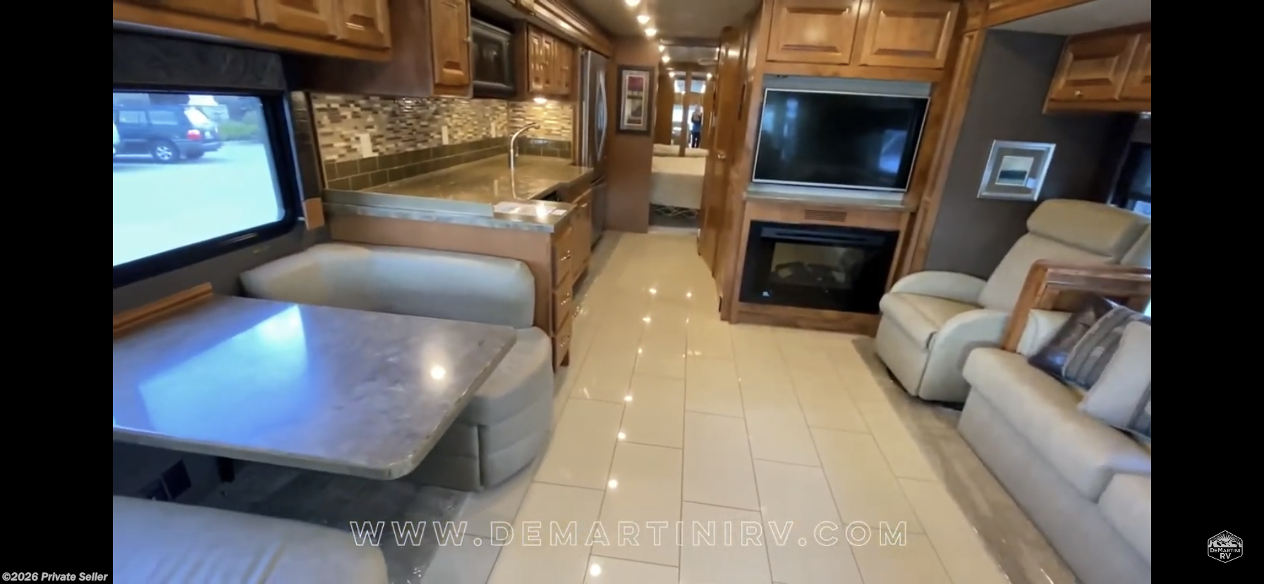 The kitchen is fully equipped with solid surface countertops, a residential refrigerator, convection micorwave, three burner cooktop, and ample storage(with pantry), allowing for easy meal preperation while traveling. Toward the rear, the master bedroom offers a king-size bed, large wardrobe storage, and optional washer/dryer, along with a spacious bathroom that often features dual sinks and a large shower for added convinience.