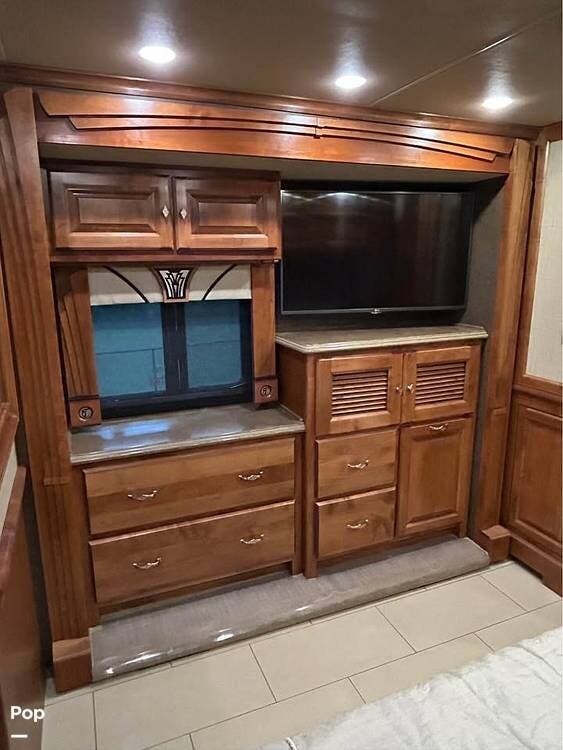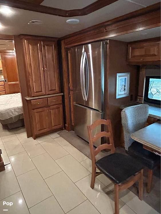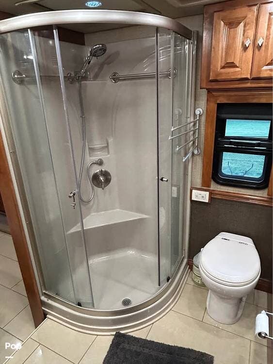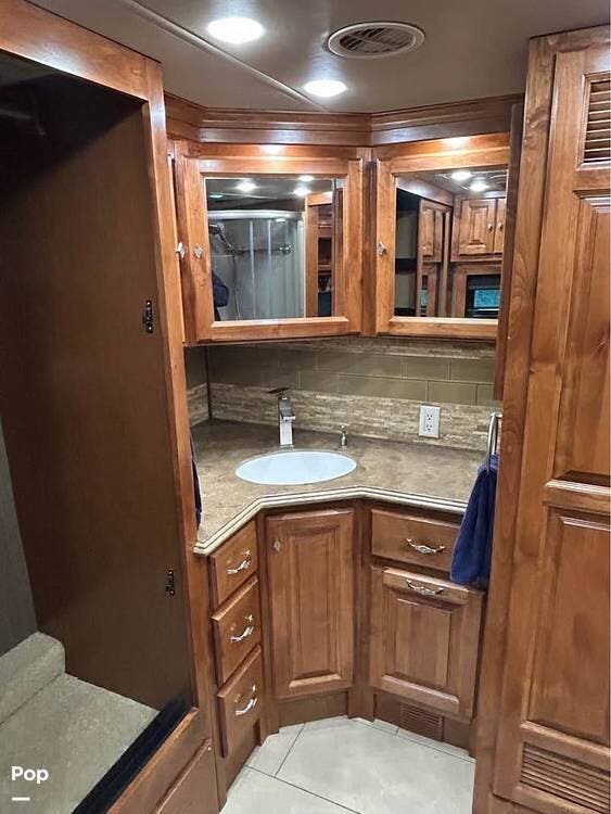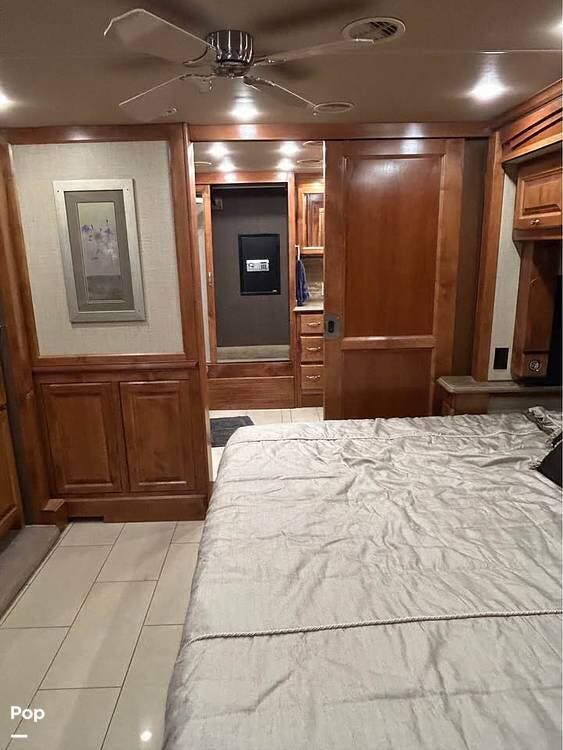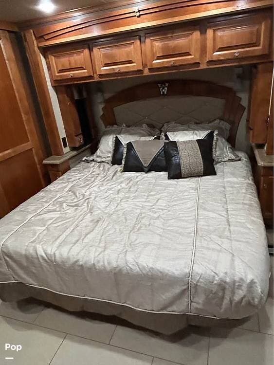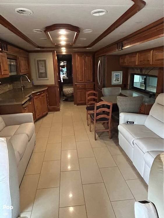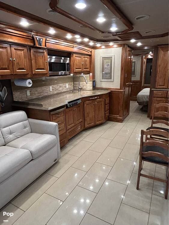 Inside, you'll find polished porcelain tile floors, a king-size bed in the master suite, and a sleeper sofa in the living area, comfortably sleeping four. The coach is equipped with three 15,000 BTU air conditioners (with heat pumps) to ensure comfort in any season.