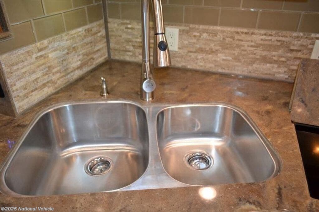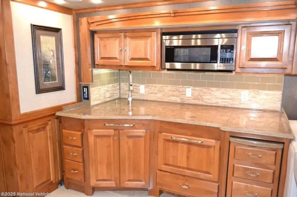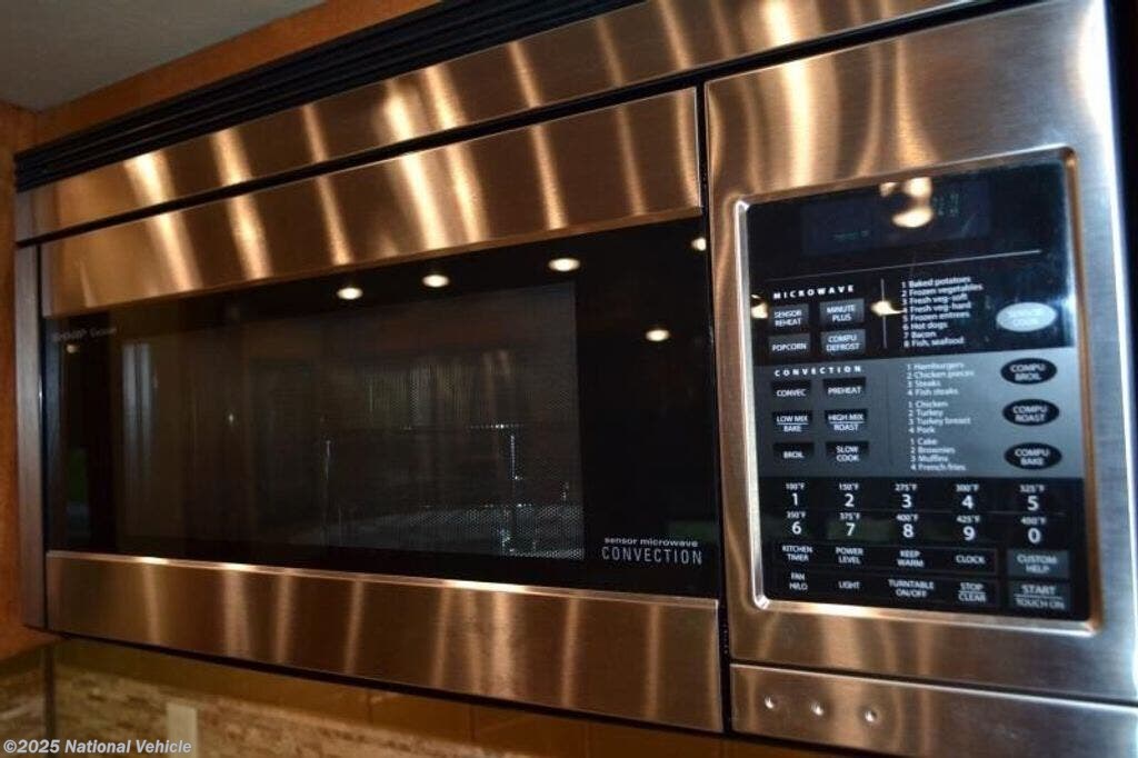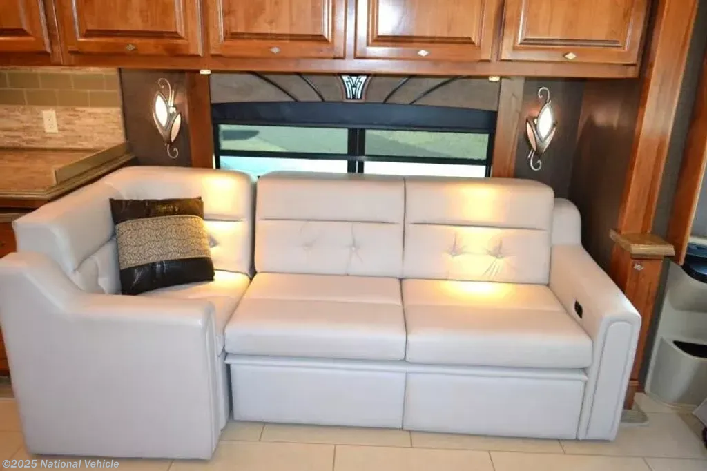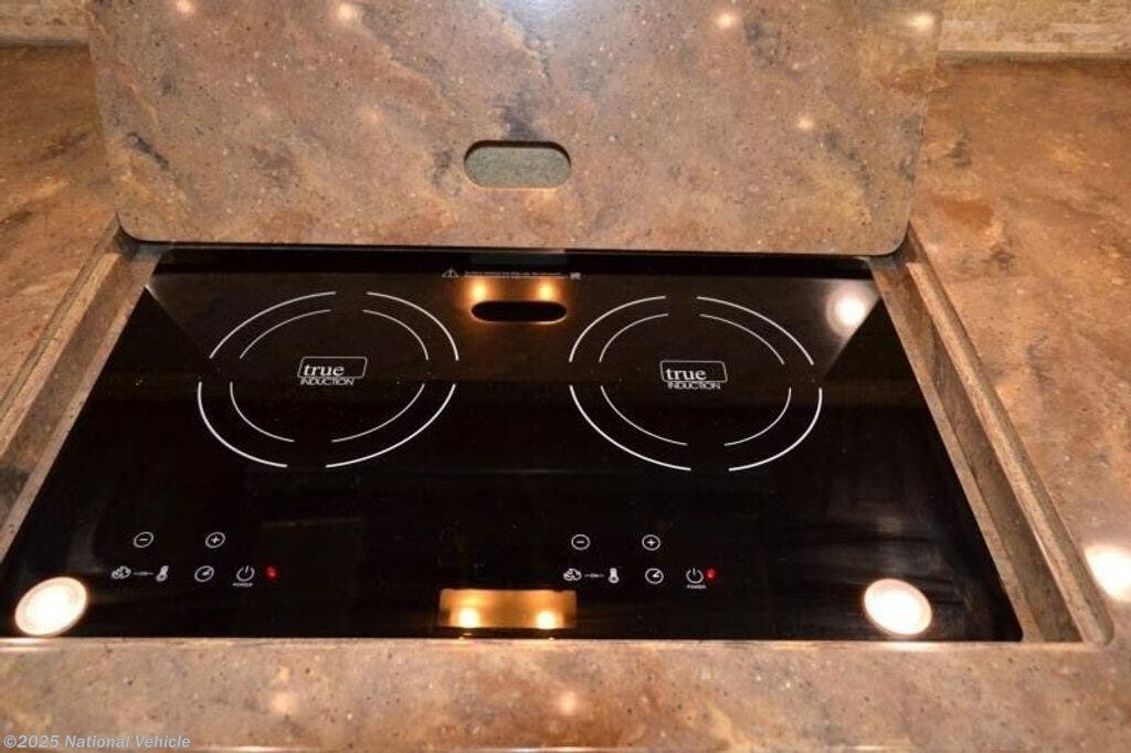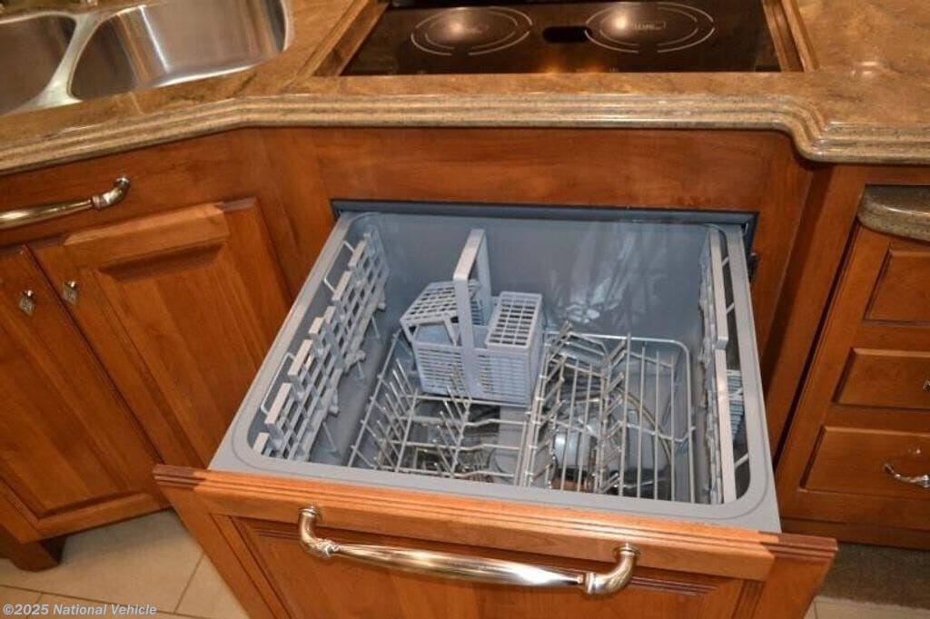 Along the opposite side of the motor home you will find that the slide has a sofa bed, convection microwave, induction cooktop, dishwasher, double kitchen sink, and overhead cabinets.