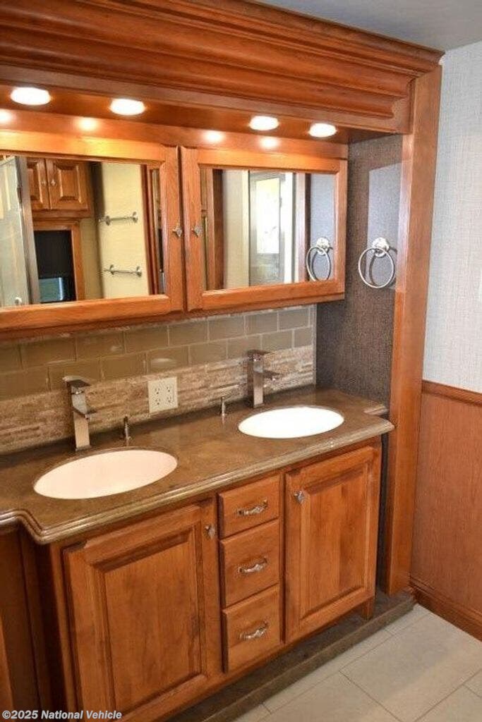 The half bath is on the right side as you head toward the rear. In the master bedroom you will find a slide out with a king bed sleep number bed with dual remotes, nightstands, and an overhead cabinet. Across from the bed the slide out features a TV, overhead cabinet, drawers, and in the bathroom area the slide continues with his/her sinks, and an overhead cabinet.