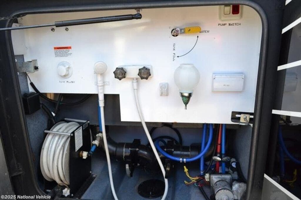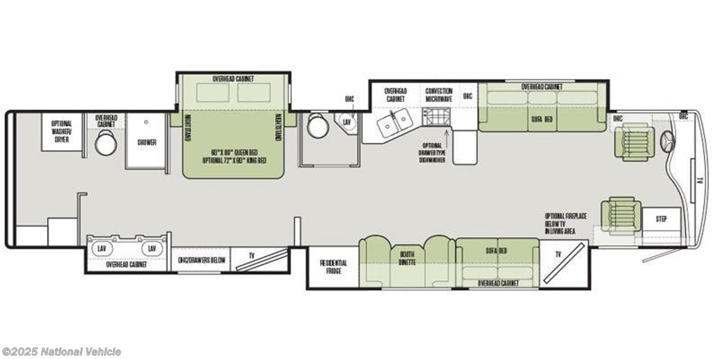 This model features a rear bathroom, a bath and a half, and a nice front living area. As you enter this motor home, you will find overhead cabinets and a TV in the cab. The slide out behind the passenger seat has a TV, sofa bed, booth dinette, and a residential refrigerator with an ice maker.