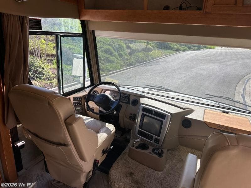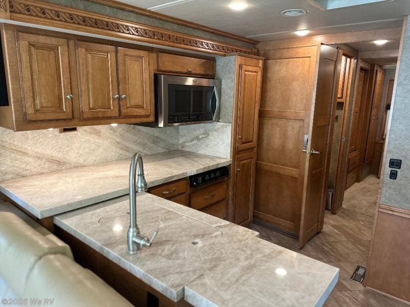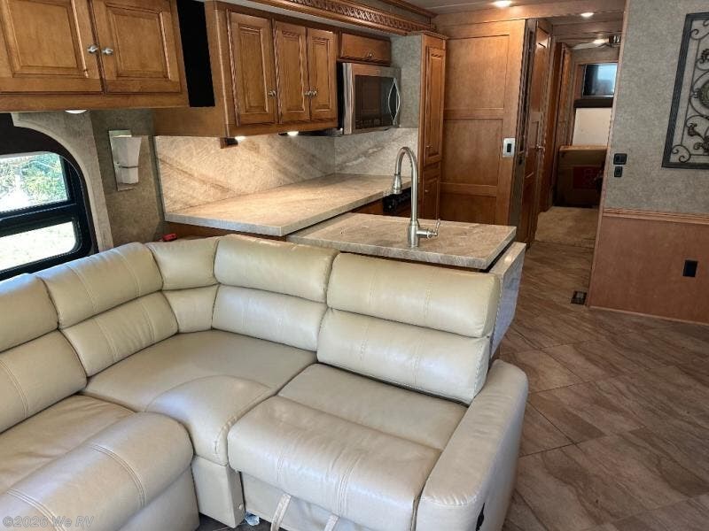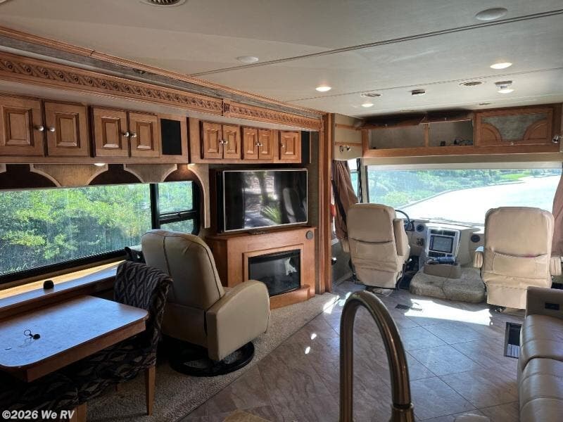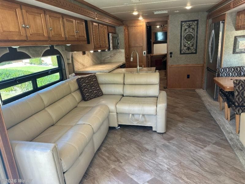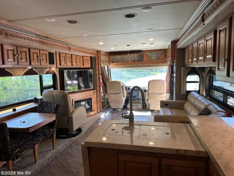 Opposite the door side find a slide out residential refrigerator, and a Glide and Dine dining table with chairs and a buffet. You will also enjoy here a Euro recliner, a corner entertainment center with 48" HDTV, and fireplace.