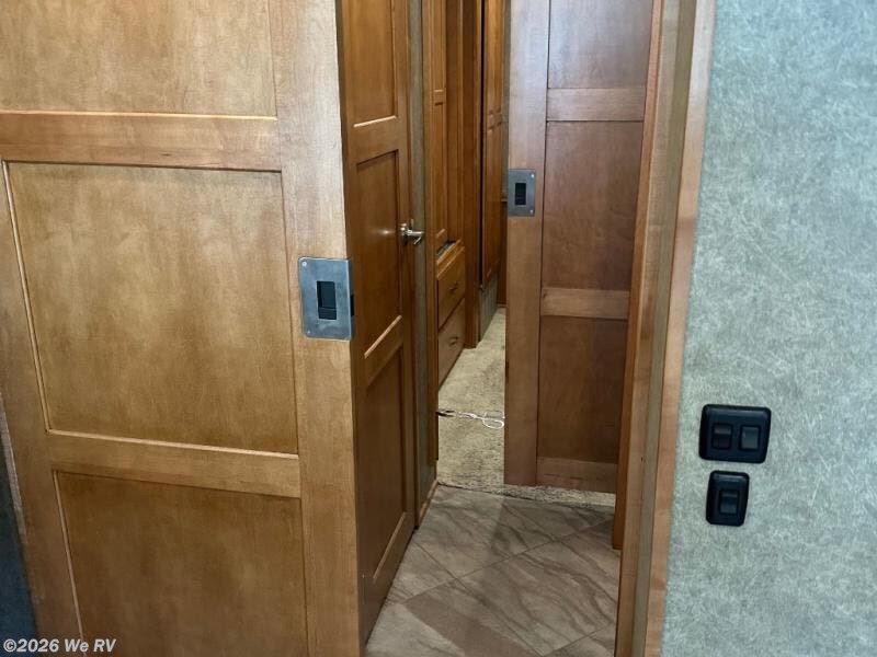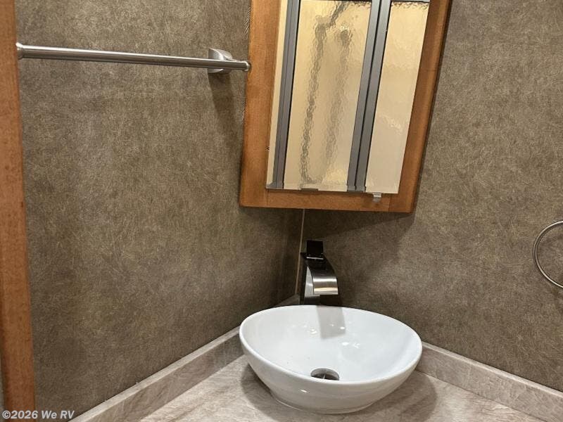 Head back toward the rear of the coach to find a split bath with a private toilet area including a a sink on the left. There is a private shower and vanity with sink on the right.