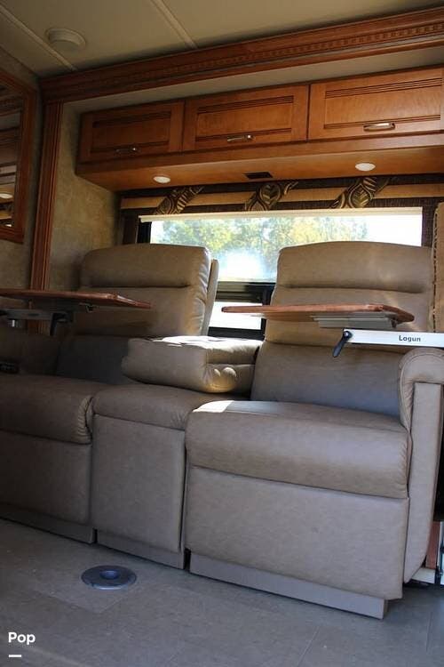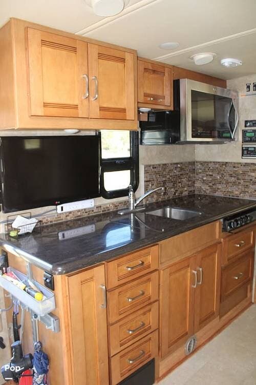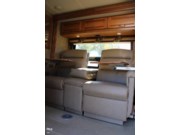 Kitchen is plenty big for a coach of this size. Standard sofa was replaced with beautiful premium Ultra leather recliner set (see photo). Corian hard surface countertop. LED lighting updated in most areas.