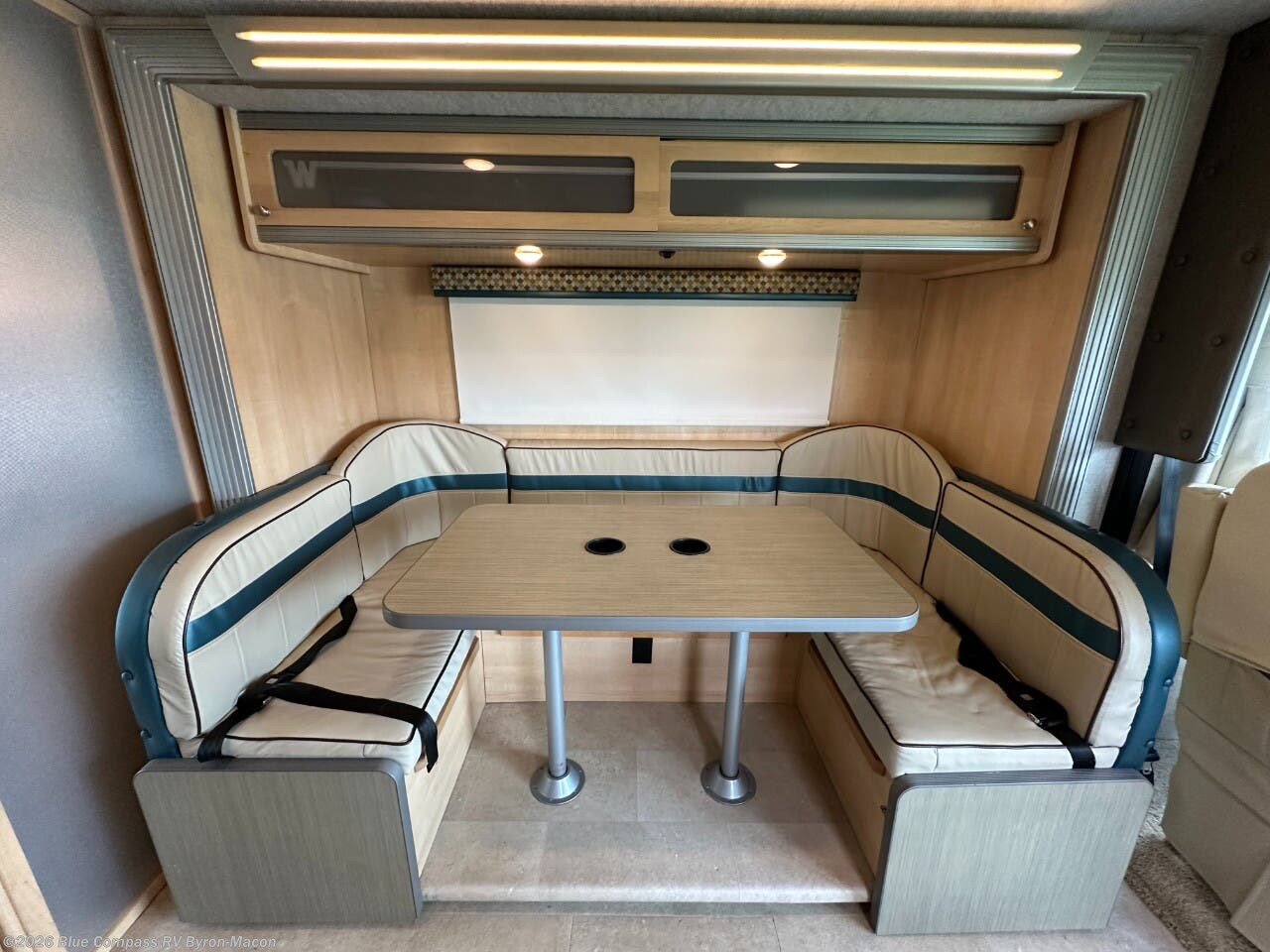 Straight ahead find a slide out u-shaped dinette for seating at mealtime. There are three sets of seat belts that will keep your passengers safe while traveling down the road. Plus there is overhead storage space too.