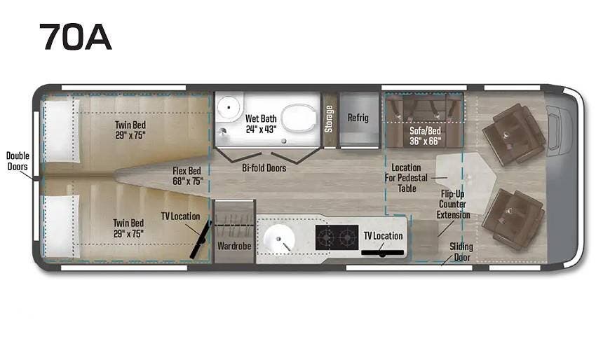 The kitchen setup includes a 2-burner stove with a glass cover, microwave, refrigerator/freezer, and Corian countertops with a flip-up extension. A pedestal table and storage cabinets provide space for meals and supplies.