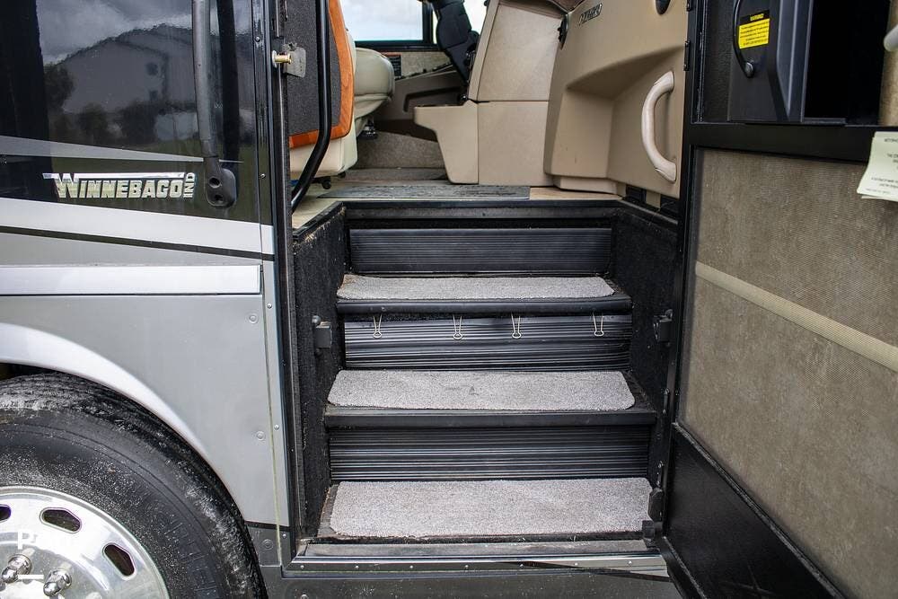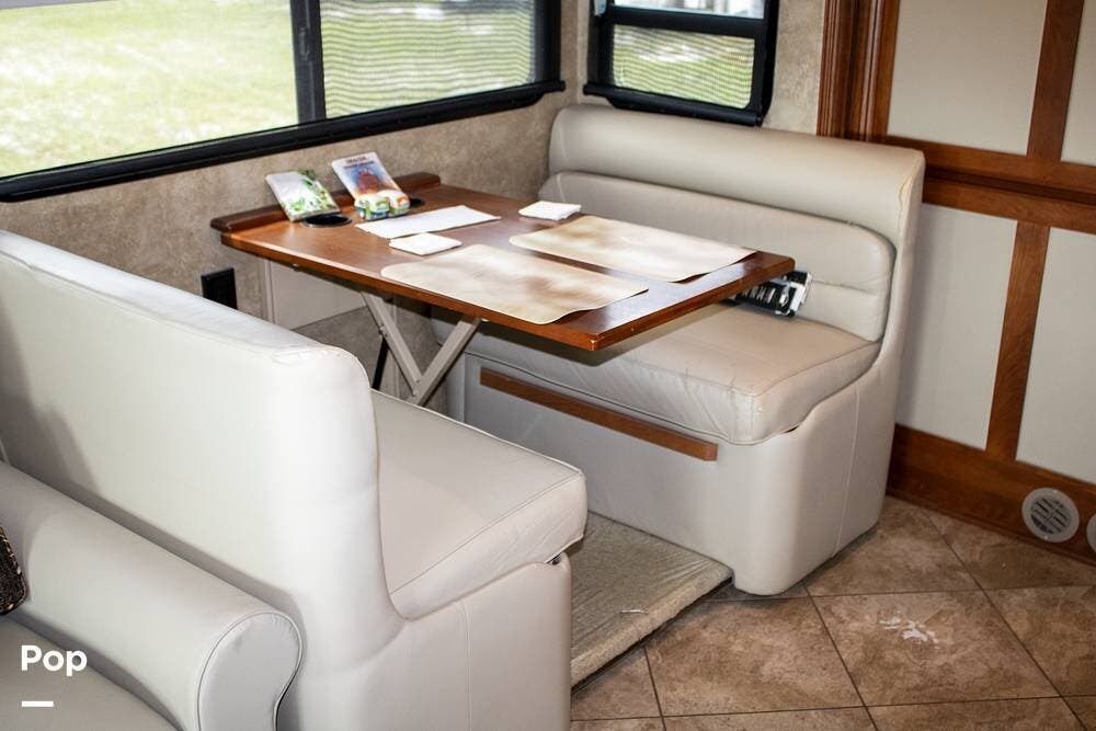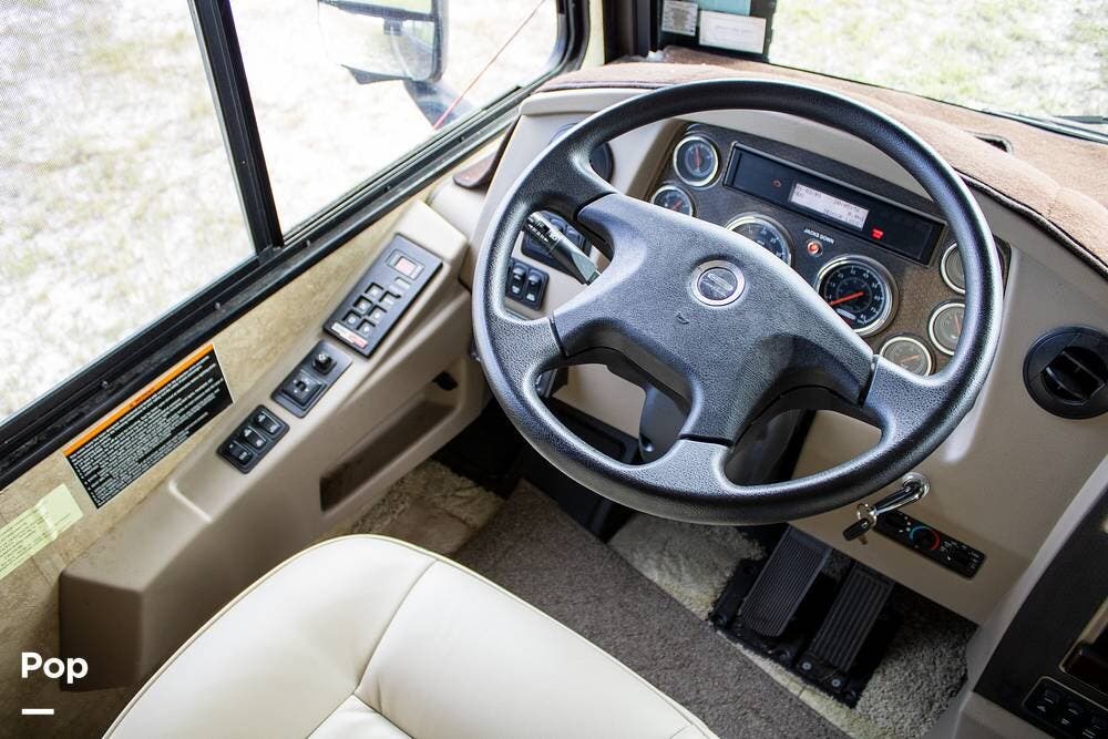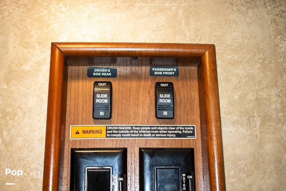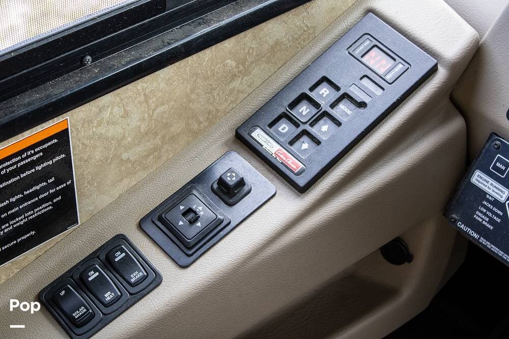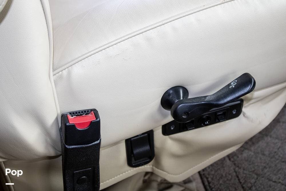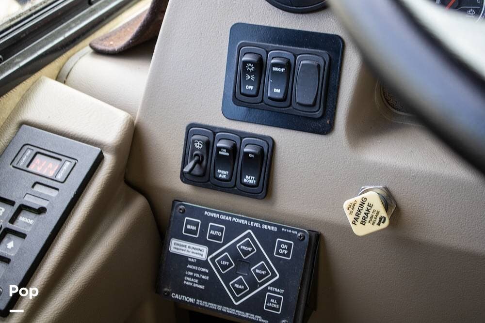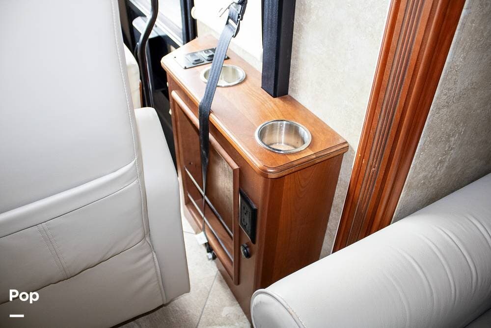 Both captain's chairs are power-adjustable, with the passenger side featuring a built-in desk, USB ports, and AC outlet. The driver's controls include a rear and side-view camera monitor, auto-leveling, an electric windshield shade, an exhaust brake, and a push-button generator start.