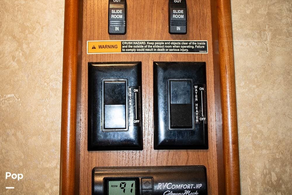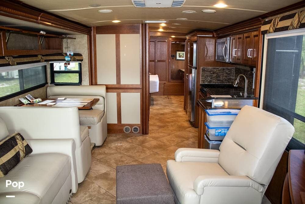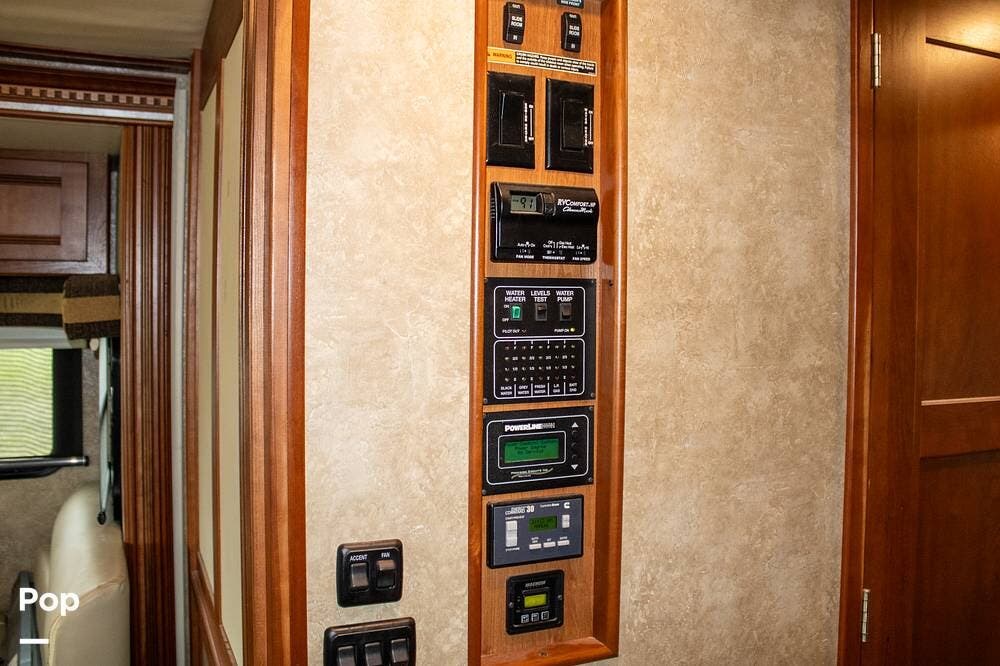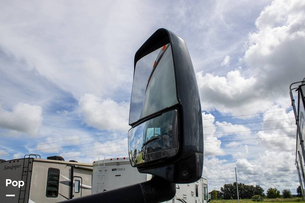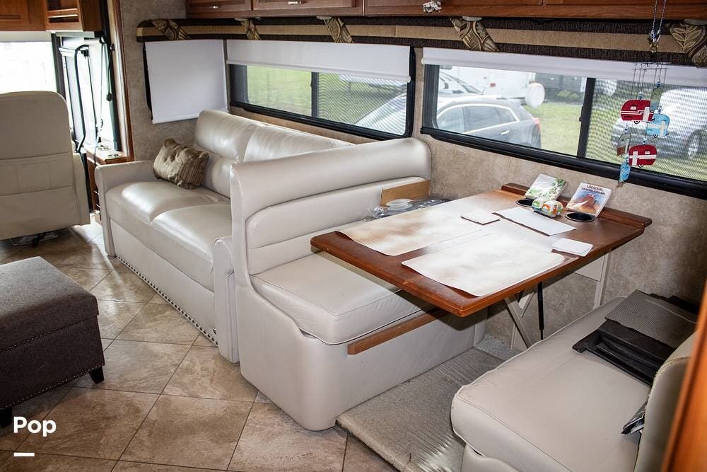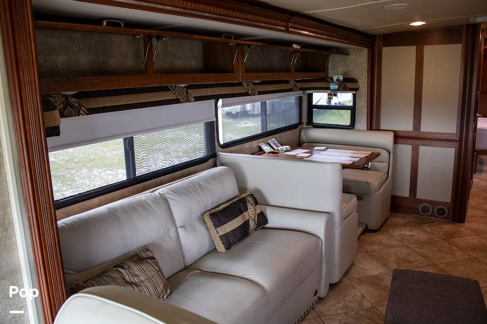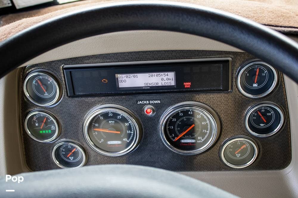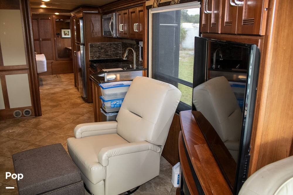 Both captain's chairs are power-adjustable, with the passenger side featuring a built-in desk, USB ports, and AC outlet. The driver's controls include a rear and side-view camera monitor, auto-leveling, an electric windshield shade, an exhaust brake, and a push-button generator start.