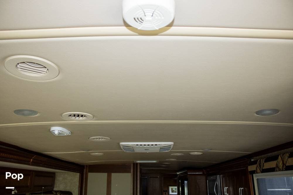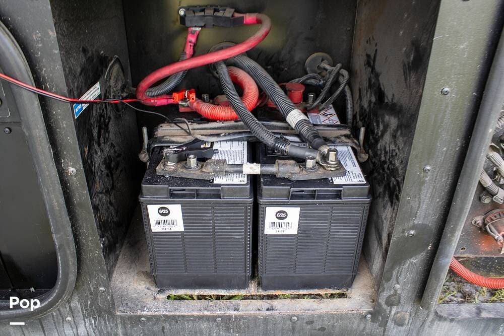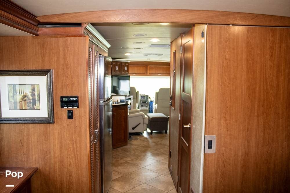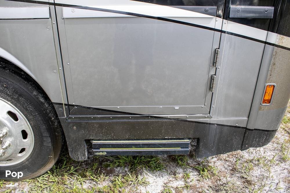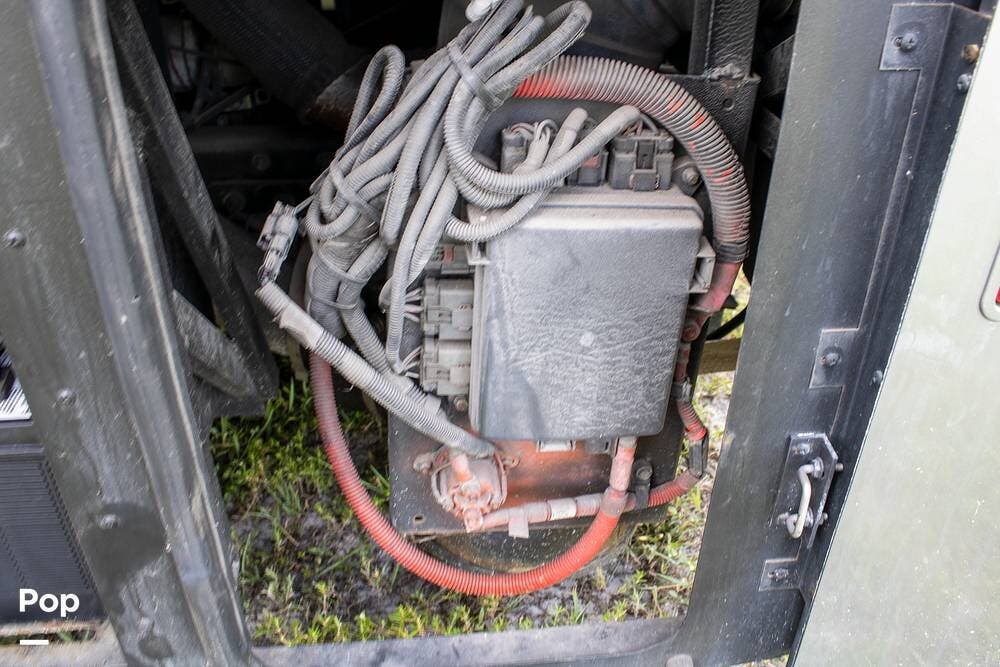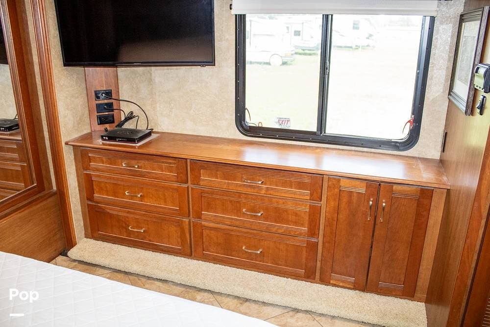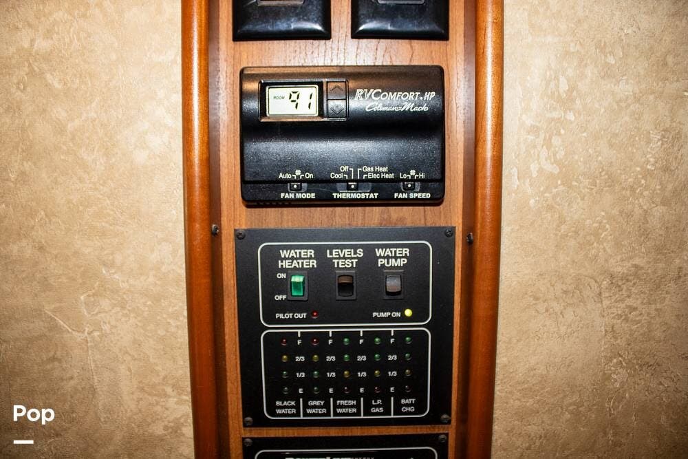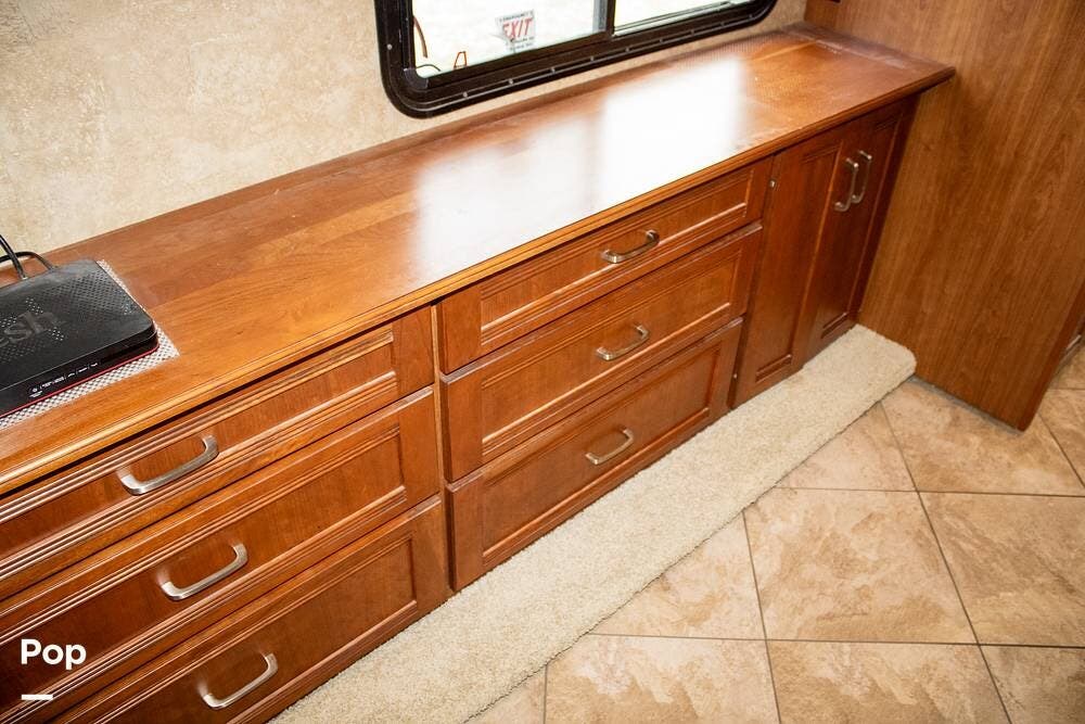 Both captain's chairs are power-adjustable, with the passenger side featuring a built-in desk, USB ports, and AC outlet. The driver's controls include a rear and side-view camera monitor, auto-leveling, an electric windshield shade, an exhaust brake, and a push-button generator start.