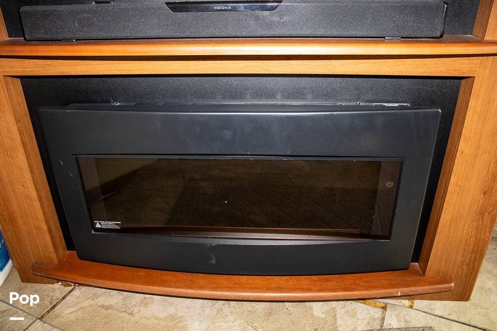 The main living area includes a 48" Smart TV, an electric fireplace, a swivel recliner, and a sleeper sofa. Windows have both day screens and full blackout shades for privacy.