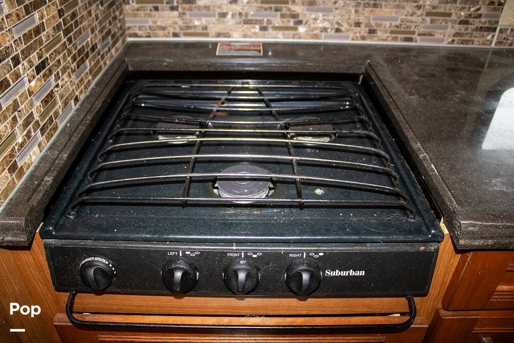 The kitchen is fully equipped with a convection microwave, propane 3-burner cooktop, full-size refrigerator with ice maker, stainless sink, and plenty of prep space. The solid wood dinette also converts to a bed.